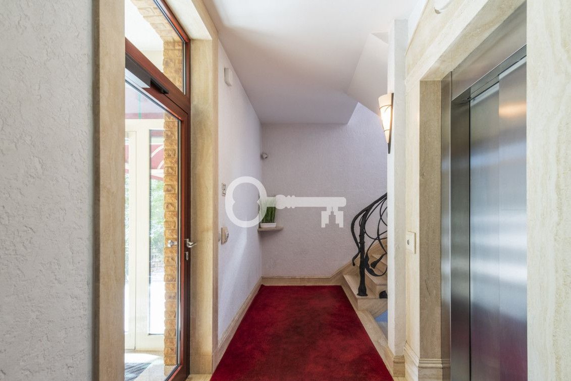Further inside, you’ll find four rooms/bedrooms, two bathrooms, a guest WC, and a walk-in wardrobe. The flooring, baseboards, and doors are made of walnut wood. One of the bedrooms features a private bathroom with a Kludi rain shower system. The bathrooms are fitted with premium fixtures from Villeroy & Boch and Cooke & Lewis. The apartment is air-conditioned, offering comfort, peace, and luxury.