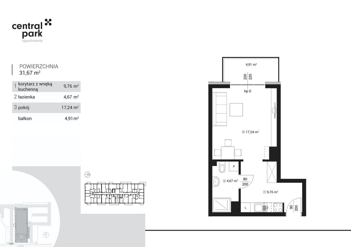 Składa się z dużego, słonecznego pokoju, oddzielnej kuchni, łazienki i przedpokoju. Przynależy do niego zadaszony balkon. Powierzchnia całkowita: ok. 32 m2.
