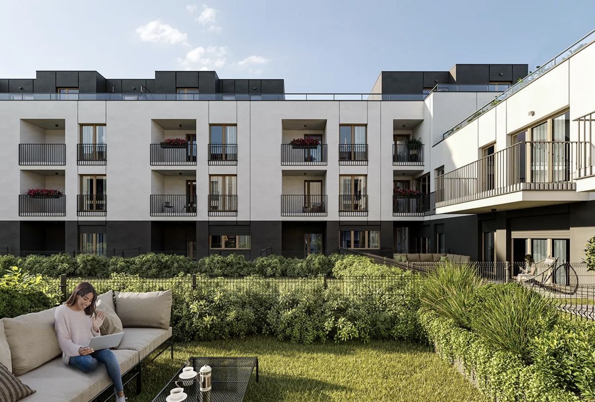 Budynek z windami, podziemną halą garażową, lobby oraz pięknie zagospodarowaną zielenią.