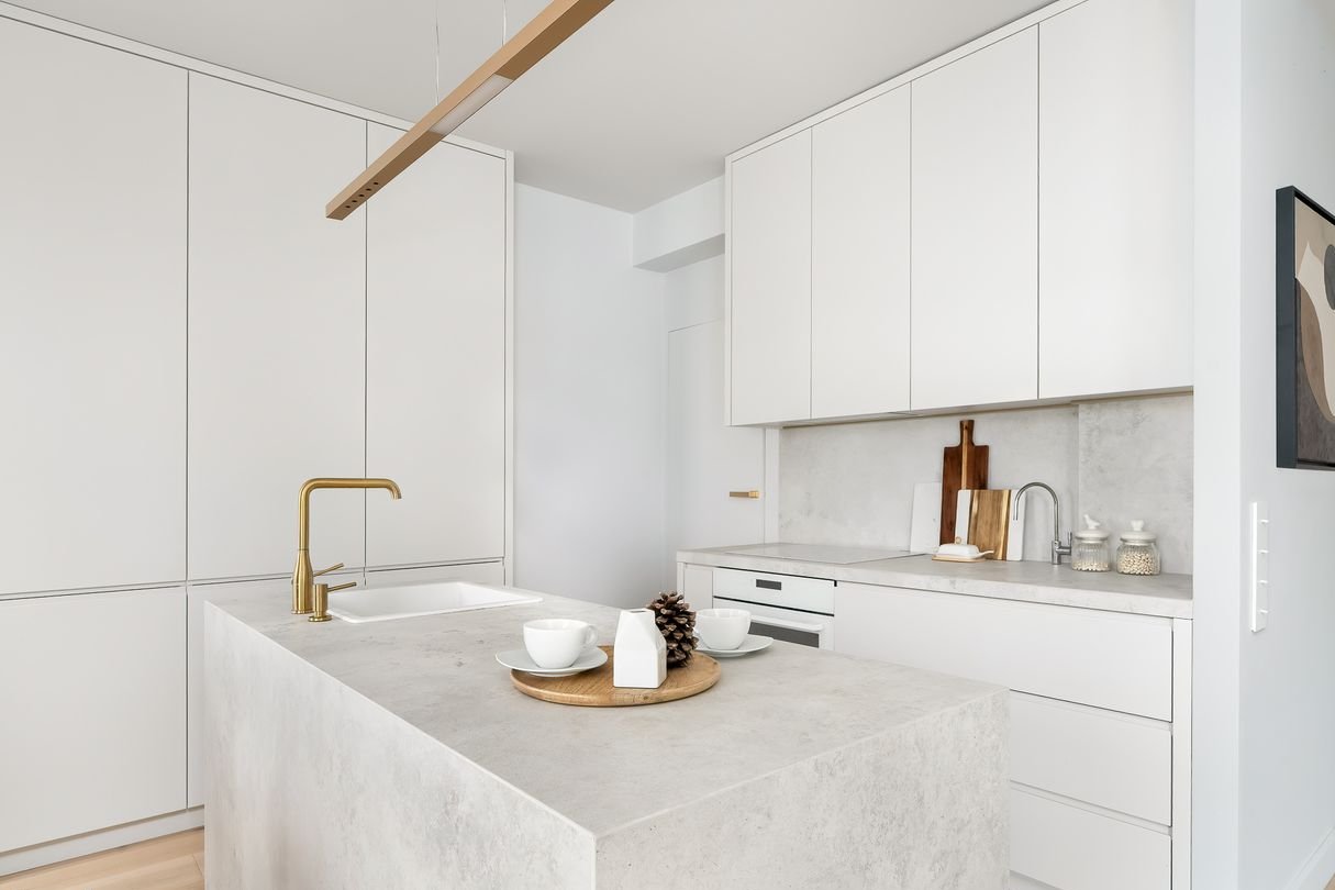 Zabudowa kuchenna ze sprzętem AGD: biała płyta indukcyjna Elektrolux, wyciąg kuchenny, szeroka zmywarka Elektrolux, lodówko-zamrażalka Beko w zabudowie. System szafek z cichym domykiem, podwójne szuflady, wygodne wyjeżdżane półki.