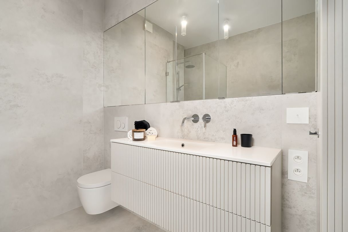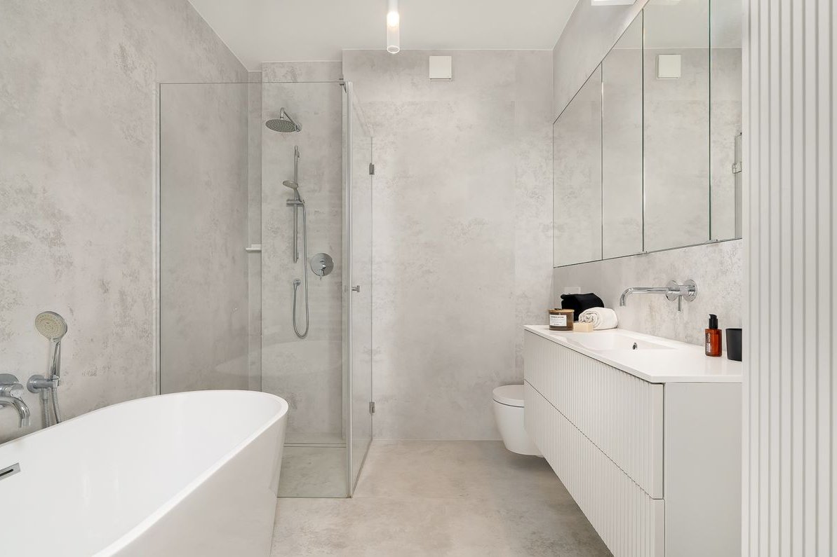 łazienka z wanną i prysznicem, wc, liczną zabudową meblową, ogrzewaniem podłogowym (ok 7 m2)