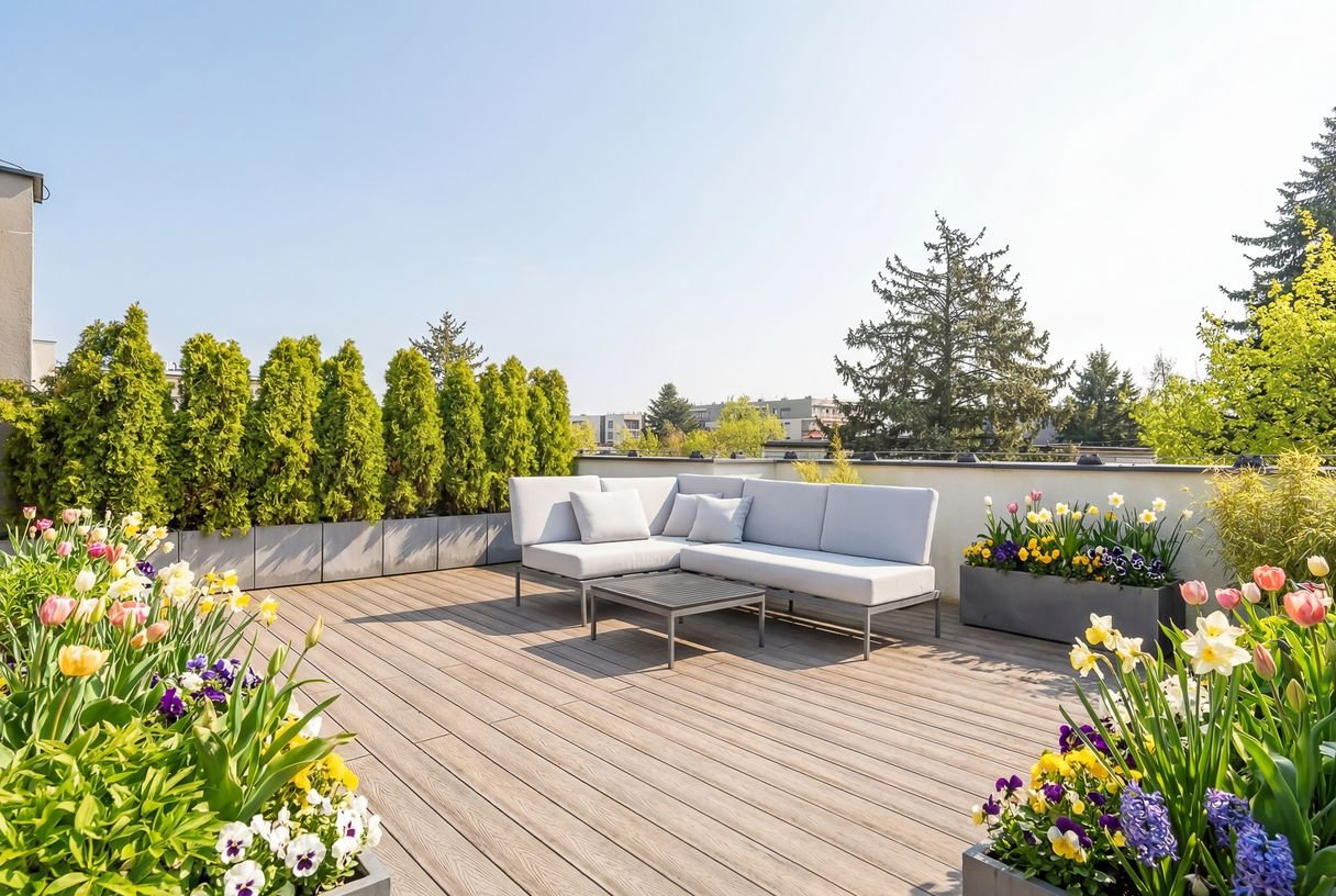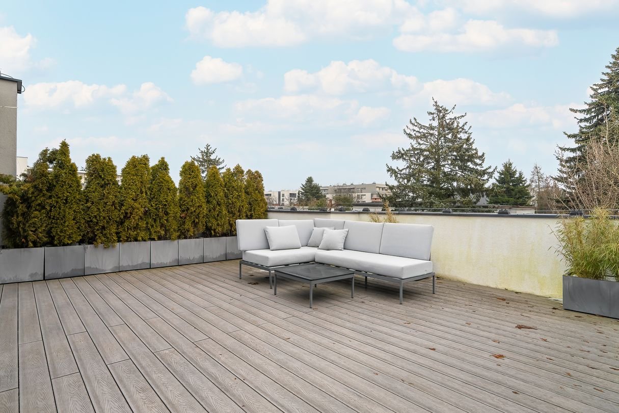 Na dachu fantastyczny przeszło 40 metrowy taras, wyłożony deską tarasową, donice z krzewami i ujęcie wody z zewnątrz do podlewania roślin.