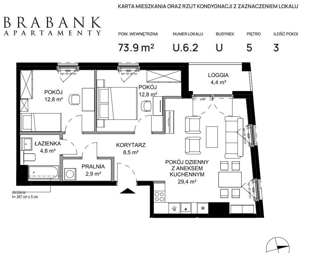 Apartament jest w stanie deweloperskim dzięki czemu można go dopasować całkowicie do własnych potrzeb. Standard inwestycji Brabank to wyjątkowej klasy format wyjątkowej architektury, płynnie łączący szacunek do historii z architektonicznym kunsztem. Inwestycja była nagradzana w międzynarodowych konkursach: „Best Residential Development Poland”. Elegancka paleta barw, wysublimowane połączenie odcieni i szlachetnego mosiądzu w połączeniu z białym włoskim marmurem w częściach wspólnych podkreśli wysoką klasę inwestycji.