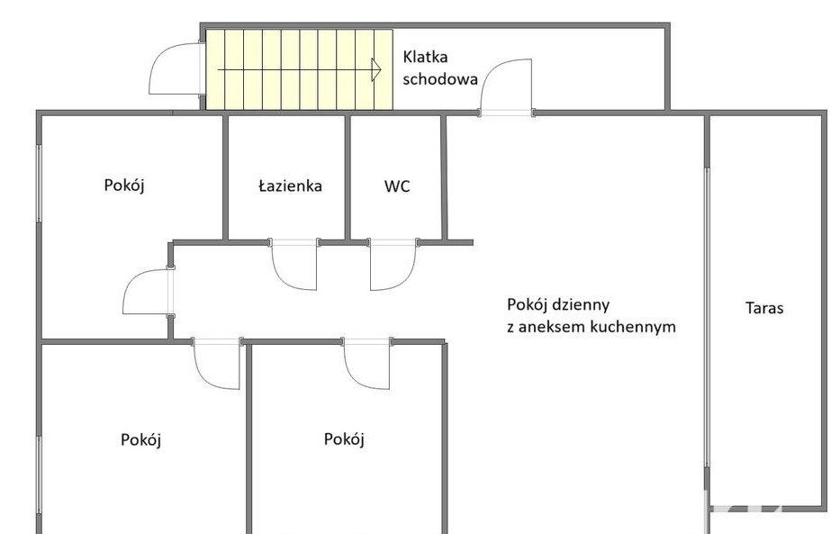- 4 pokoje: duży pokój dzienny z aneksem kuchennym + 3 sypialnie.