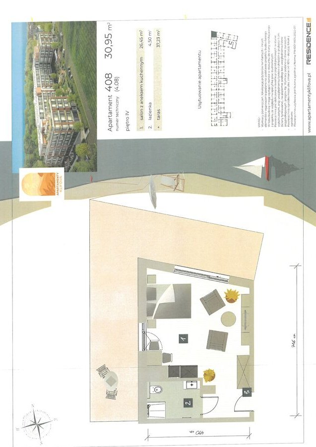 Apartament nr 4.08 o pow. 31 mkw położony jest na oststnim 4 piętrze ( jest winda), przynależy do niego duż taras 42 mkw, który stanowi ogromny atut dla małego i przytulnego apartamentu.
