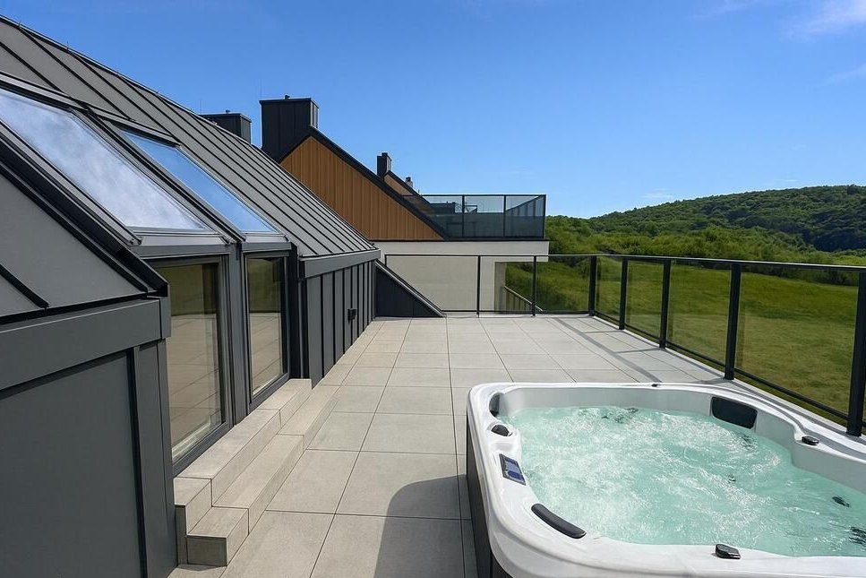 Mieszkańcy na piętrze będą mogli cieszyć się dwoma balkonami i tarasem, na którym bez problemu można umieścić jacuzzi. Miejsce to zostało zaprojektowane z myślą o odpoczynku na świeżym powietrzu i spędzaniu czasu z rodziną czy przyjaciółmi.