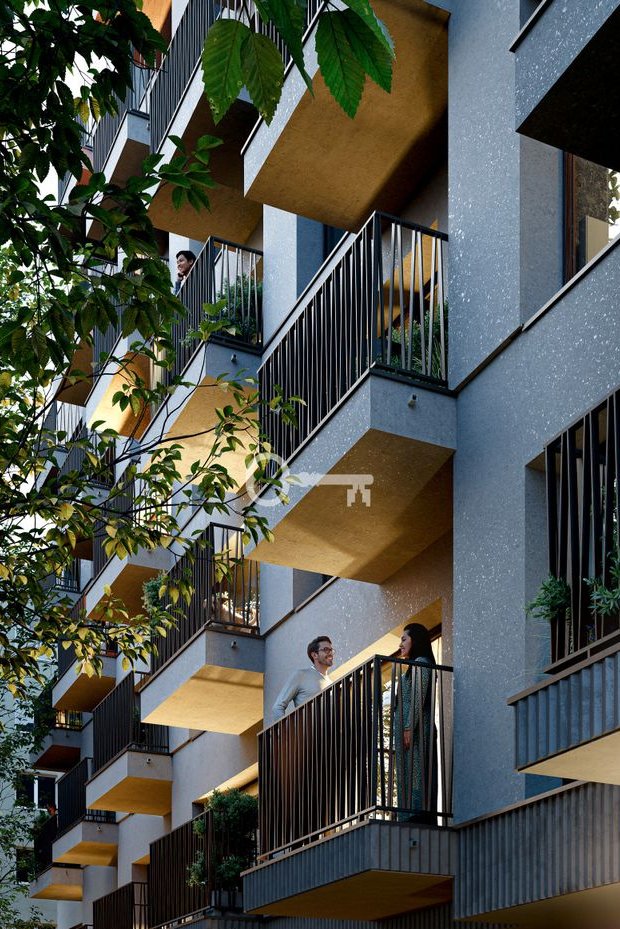 Surowość betonu, geometryczne bryły i subtelna faktura elewacji podkreślają industrialny styl inwestycji, wpisując się w wyjątkowy klimat Pragi Północ.