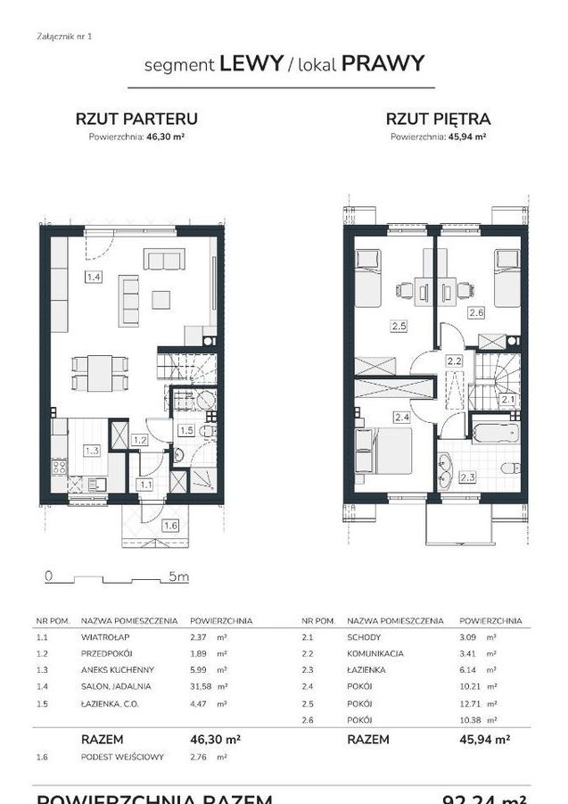 Każdy lokal o powierzchni 92,24 m2 zapewnia wygodną przestrzeń dla rodziny. Na parterze znajduje się obszerny salon z jadalnią, kuchnia oraz łazienka z miejscem na kabinę prysznicową. Na piętrze znajdują się 3 wygodne sypialnie oraz łazienka. Dodatkową powierzchnię na poddaszu (ok. 16m2) można zaaranżować według własnych potrzeb. Inwestycja prowadzona jest w oparciu o wysoką jakość materiałów budowlanych co przełoży się nabezproblemowe użytkowanie przez lata.
