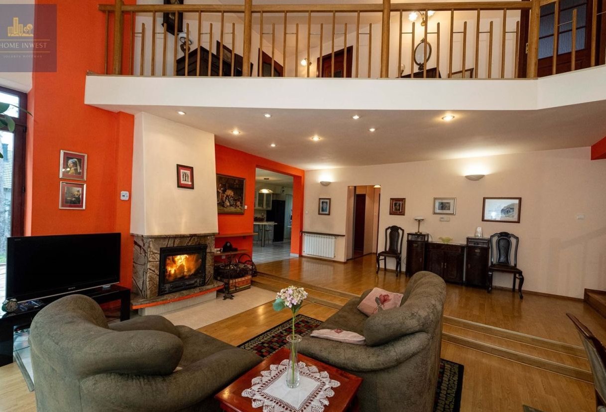 duży, wysoki salon z kominkiem (płaszcz wodny)