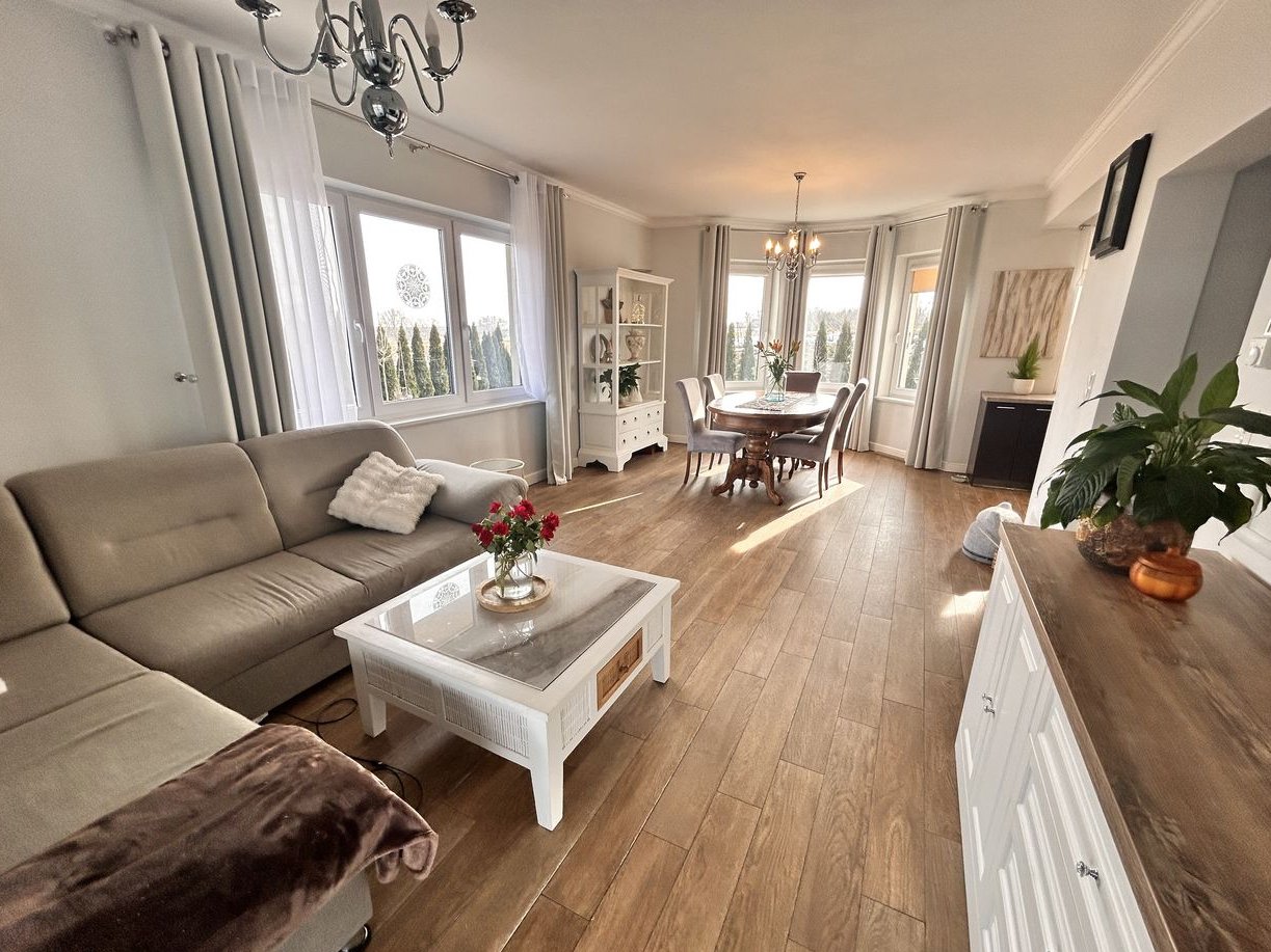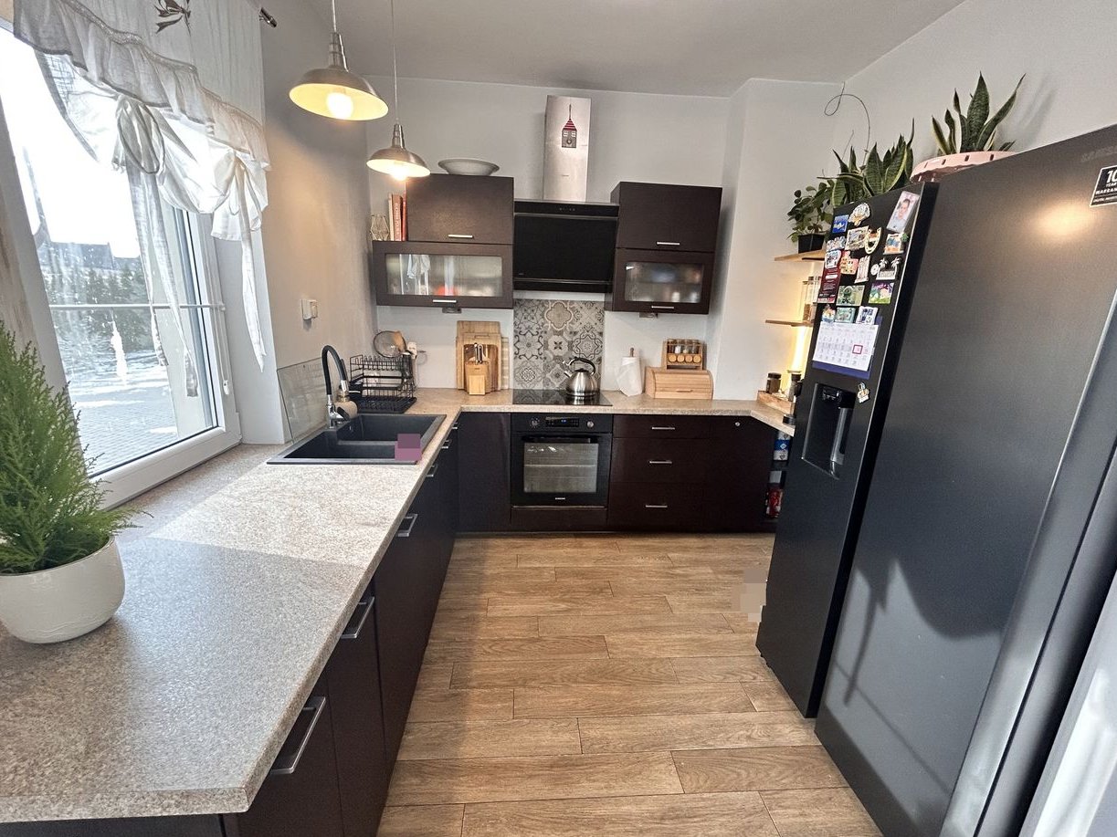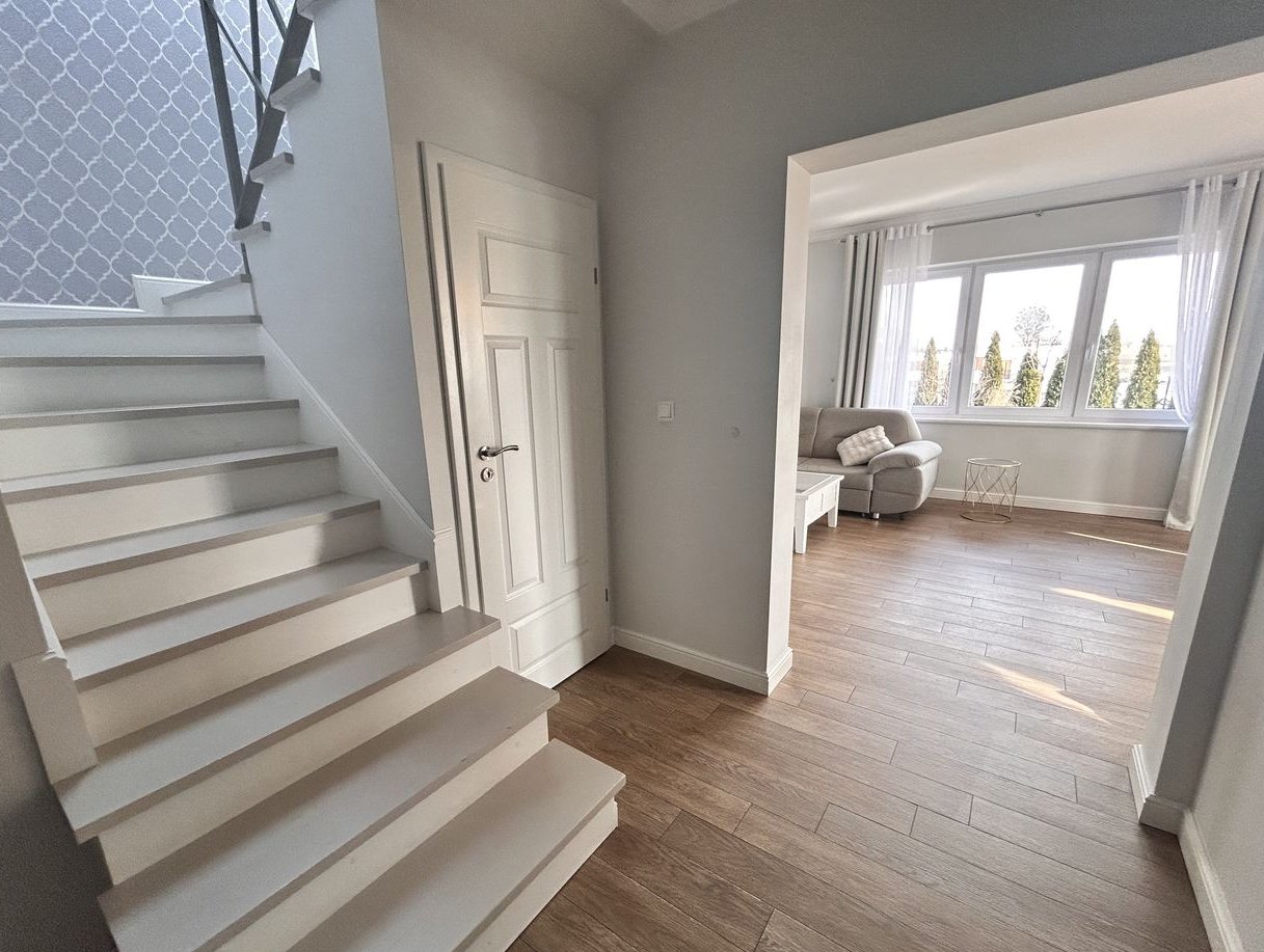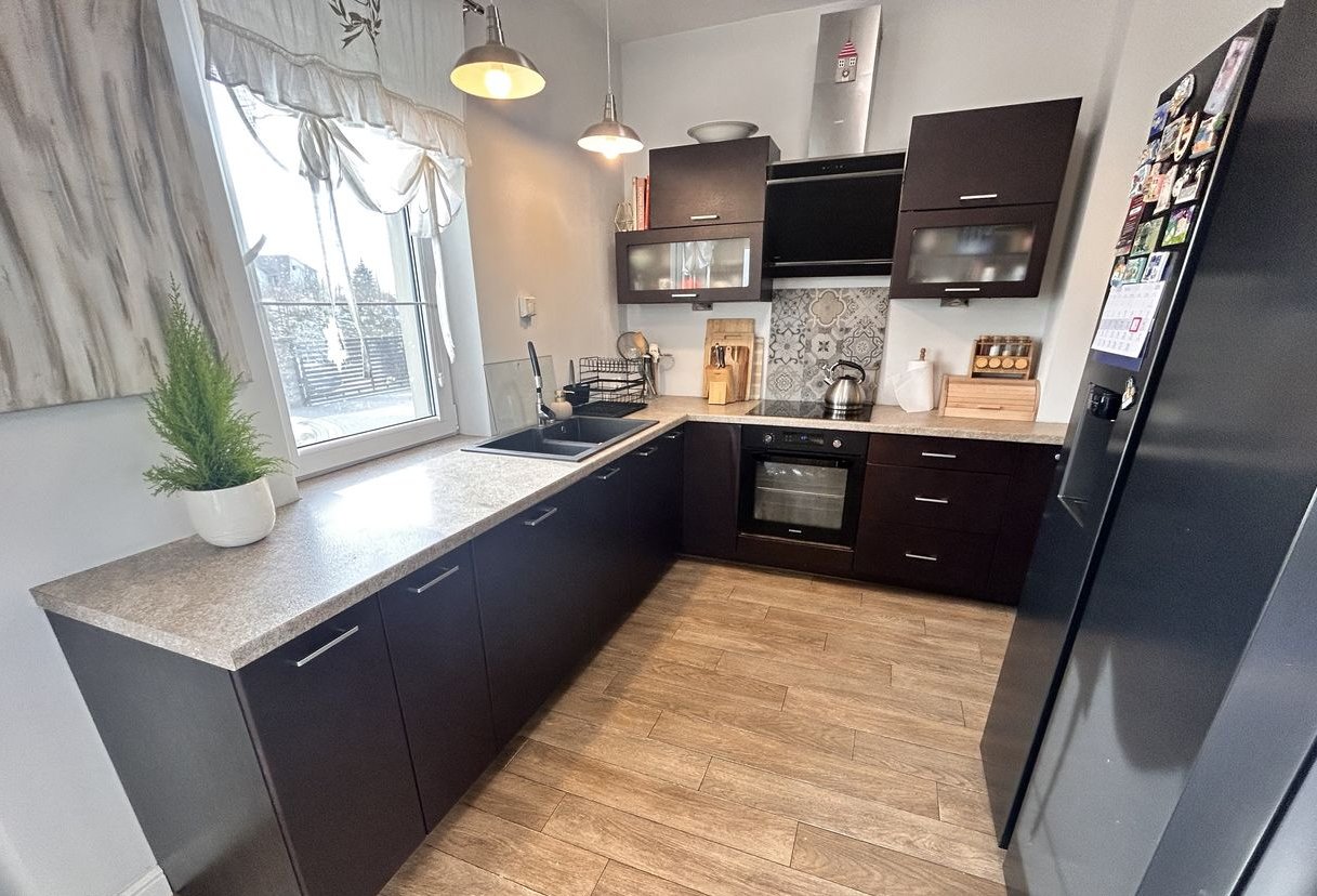 W kuchni znajduje się nowoczesna zabudowa kuchenna wraz ze sprzętem AGD (lodówka, zmywarka, płyta indukcyjna, piekarnik, mikrofalówka, okap). Salon jest duży i przestronny z wydzielonym miejscem na odpoczynek oraz TV, a także część jadalnianą z dużym stołem. W pokojach na podłodze panele oraz na ścianach gładzie. Łazienka wyposażona w wannę, WC kompaktowe, a także meble łazienkowe z umywalką. WC wyposażone zostało w stojącą umywalkę i WC kompaktowe.