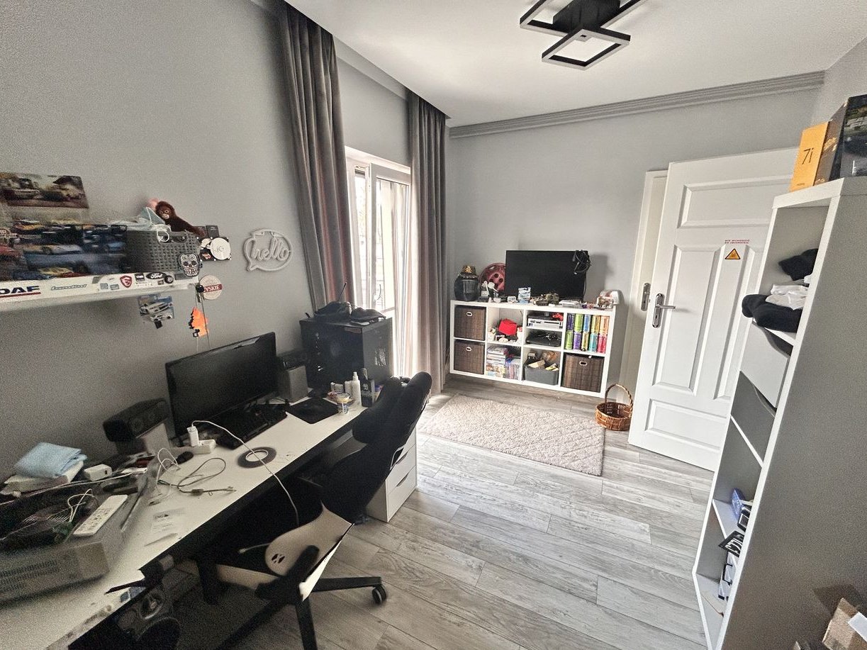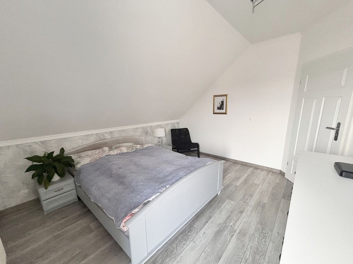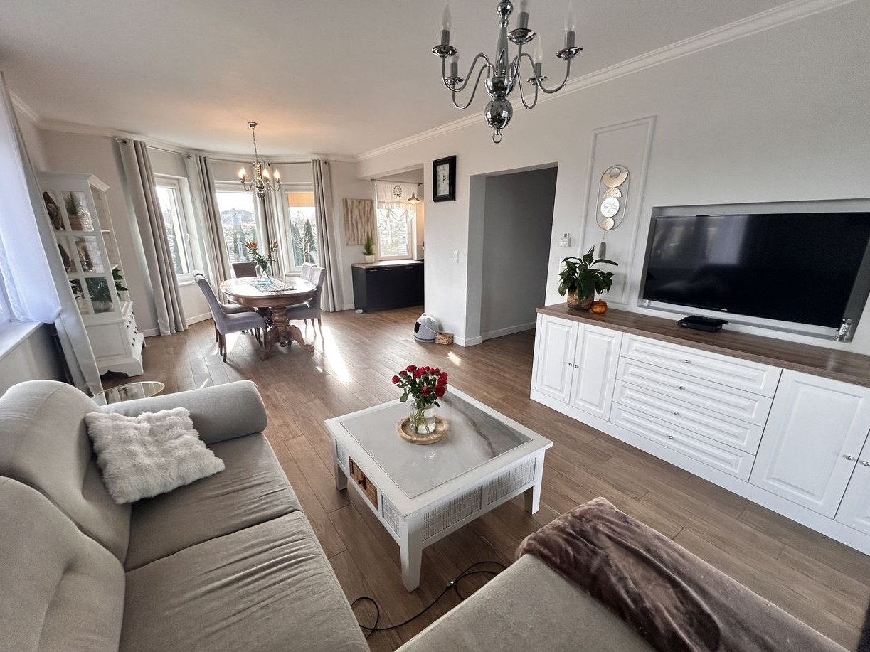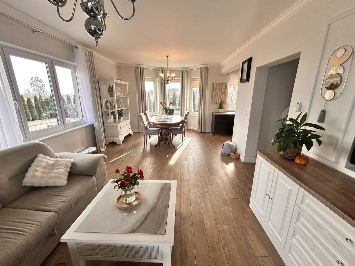 W kuchni znajduje się nowoczesna zabudowa kuchenna wraz ze sprzętem AGD (lodówka, zmywarka, płyta indukcyjna, piekarnik, mikrofalówka, okap). Salon jest duży i przestronny z wydzielonym miejscem na odpoczynek oraz TV, a także część jadalnianą z dużym stołem. W pokojach na podłodze panele oraz na ścianach gładzie. Łazienka wyposażona w wannę, WC kompaktowe, a także meble łazienkowe z umywalką. WC wyposażone zostało w stojącą umywalkę i WC kompaktowe.