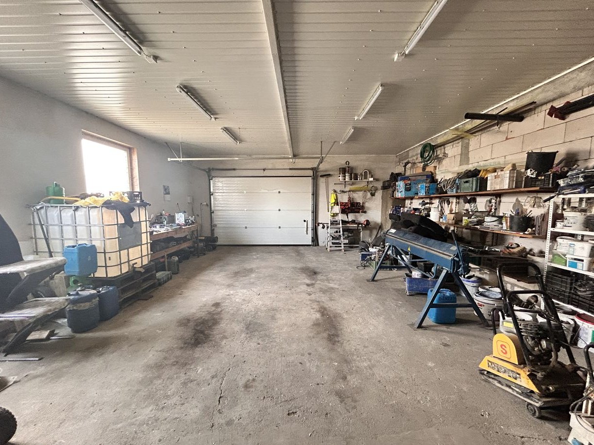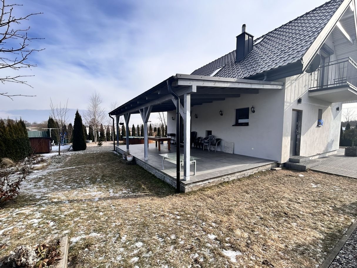Z salonu wyjście na duży, zadaszony taras wyłożony. Teren z tyłu domu do zagospodarowania trawą. Na posesji posadzono różnego rodzaju roślinność. Z boku działki wybudowano duży garaż o pow. 100 m2.