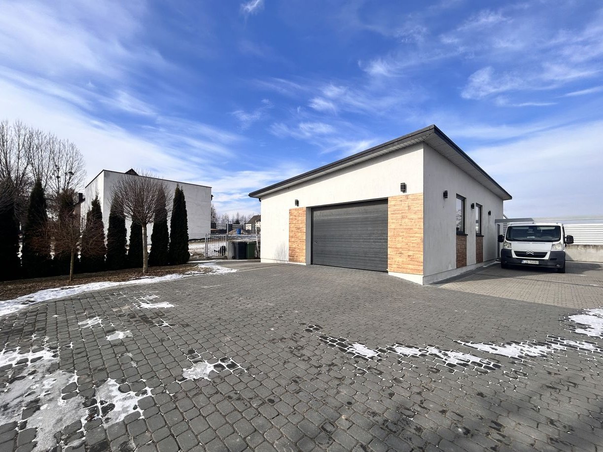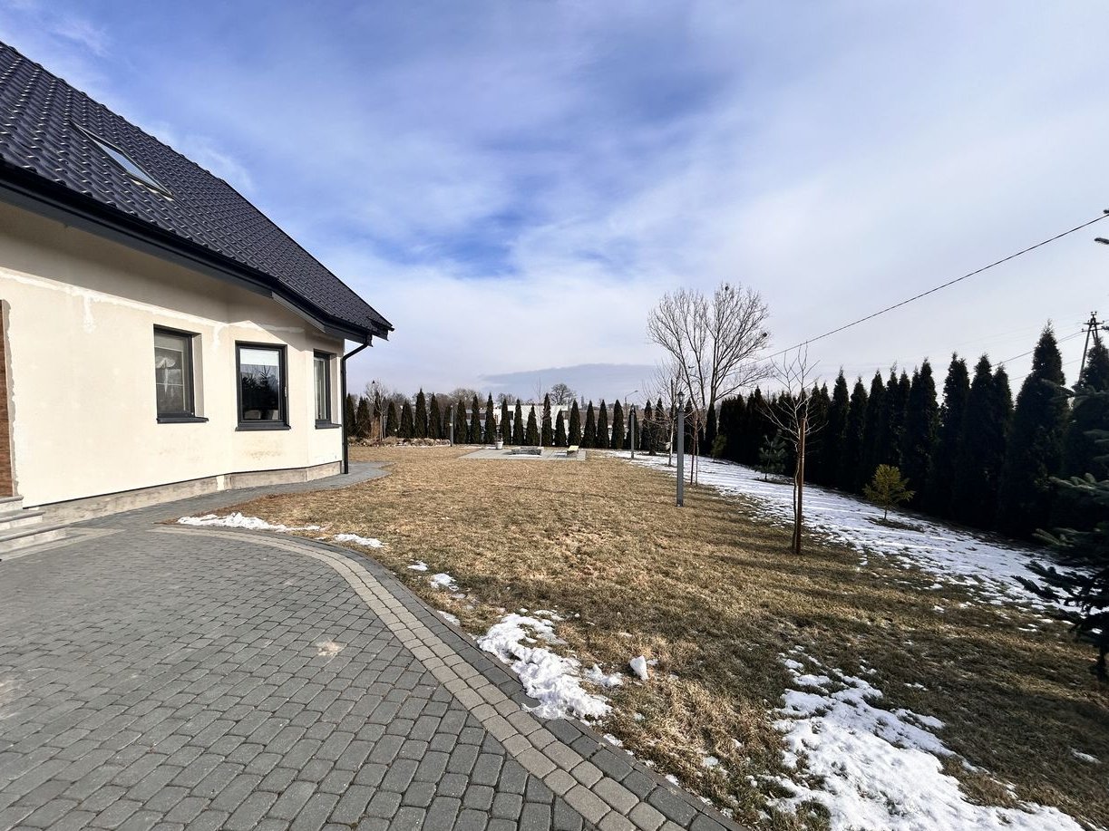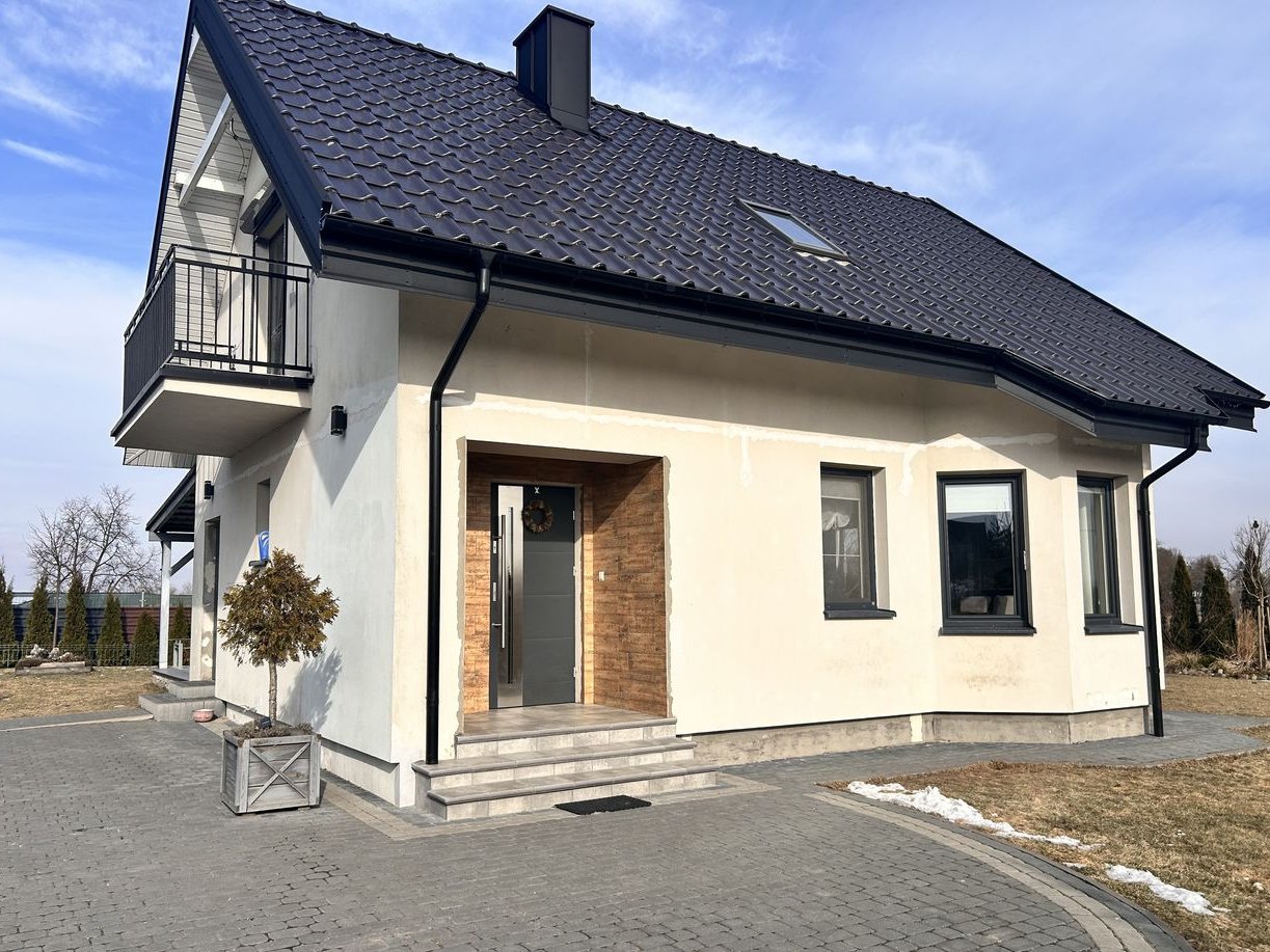 Dojazd do nieruchomości drogą powiatową, asfaltową. Wjazd na działkę przez metalową bramę otwieraną automatycznie. Ogrodzenie od frontu murowane z przęsłami metalowymi w kolorze antracytu. Wejście do domu, podjazd, dojazd do garażu oraz opaska dookoła domu zostały wyłożone kostką brukową.