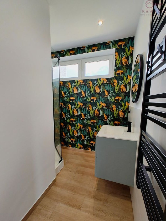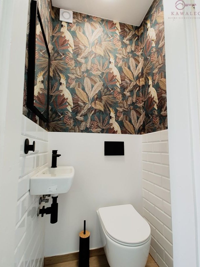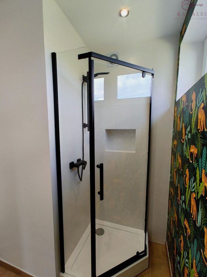Parter (55 m²): przestronna kuchnia z nowoczesną zabudową, zmywarką, piekarnikiem, płytą gazową oraz lodówką. Salon częściowo umeblowany, dodatkowo pokój sypialny lub gabinet, WC i łazienka z prysznicem