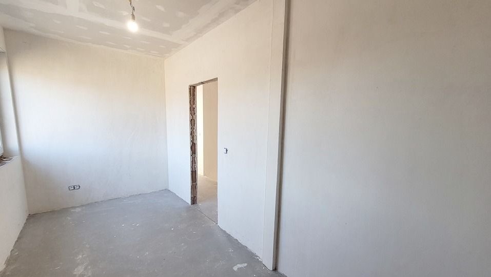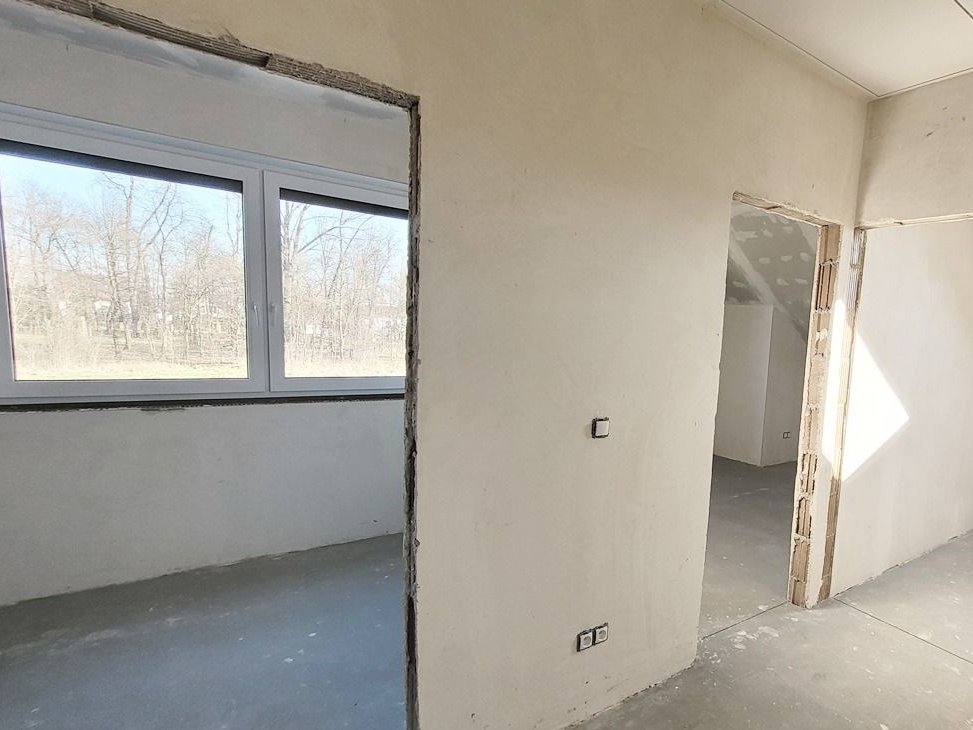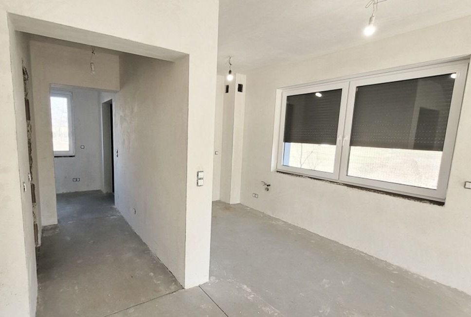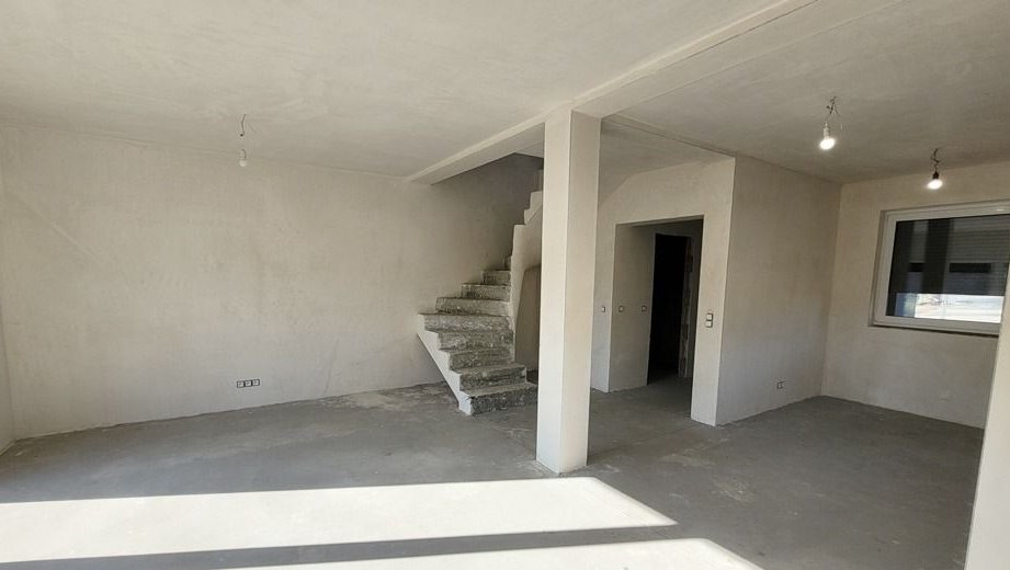 Na podłogach wylewki, na ścianach tynki , regipsy zostały zaciągnięte warstwą szpachli. W całej nieruchomości zamontowano kontakty i gniazdka bez oprawek oraz rolety sterowane elektrycznie(poza oknami dachowymi).(poza oknami dachowymi. Okna pcv wszędzie poza poddaszowymi, które są drewniane.