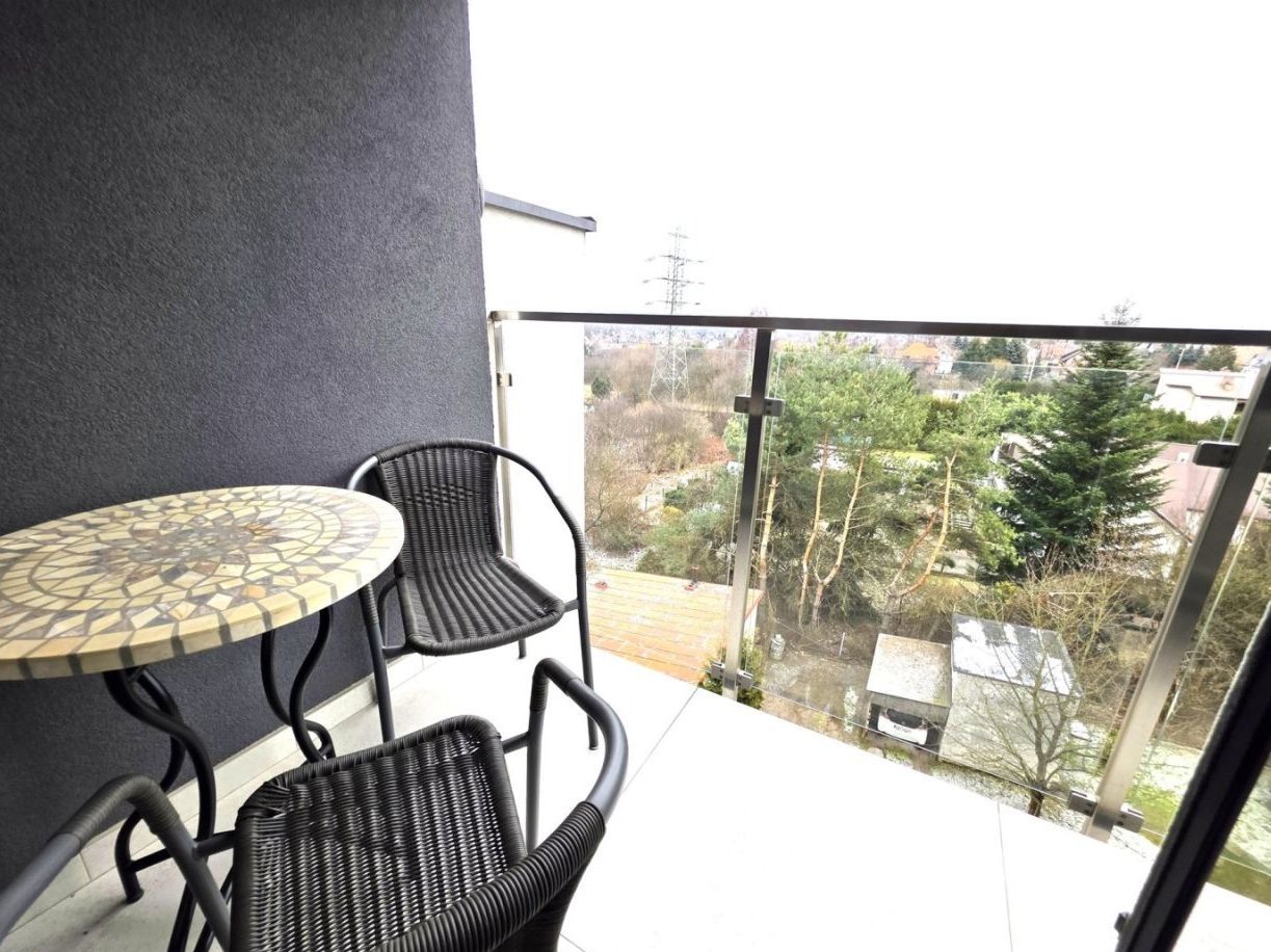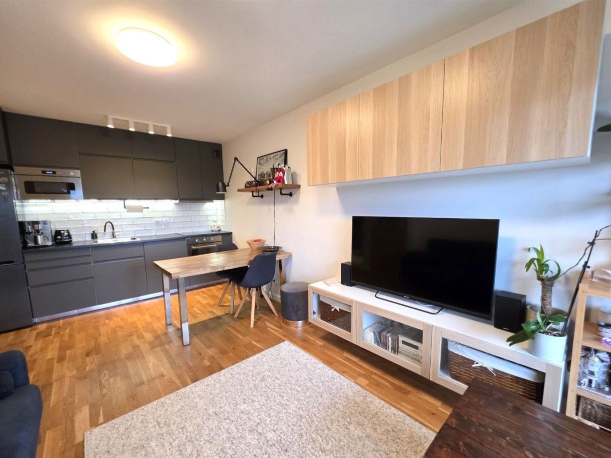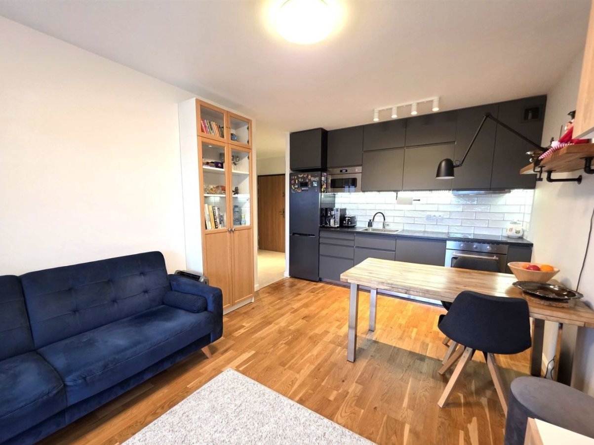 Kuchnia wyposażona połączona z salonem z wyjściem na duży balkon z pięknym widokiem na ogrody i lasek.