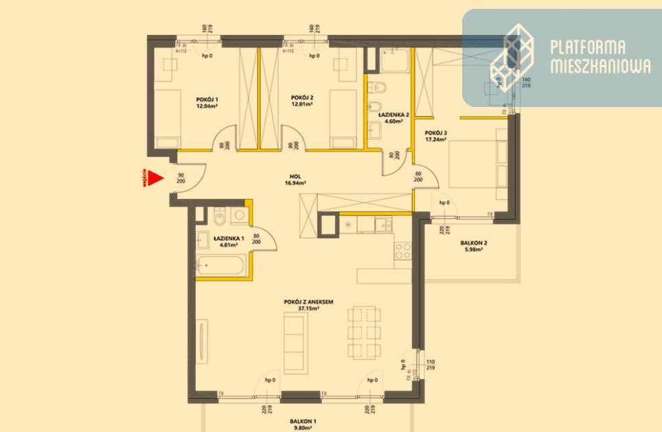 - Pokój dzienny z aneksem kuchennym i wyjściem na balkon (możliwość wydzielenia kolejnej sypialni)