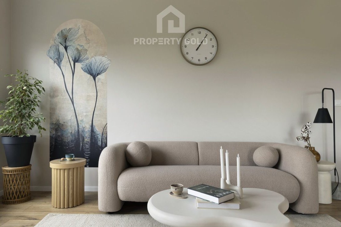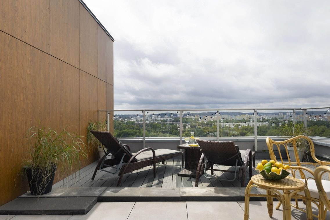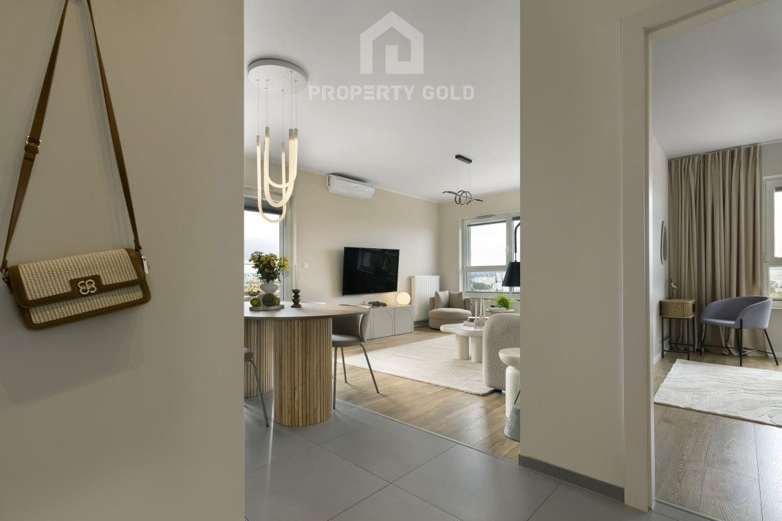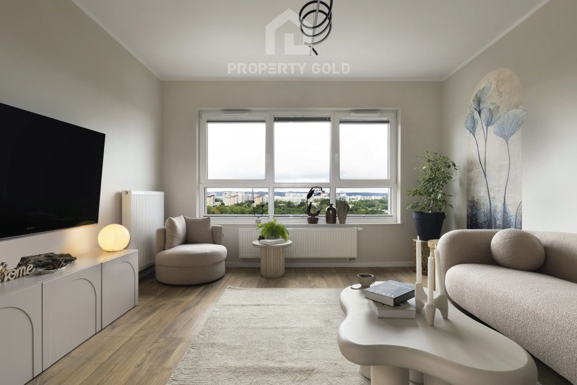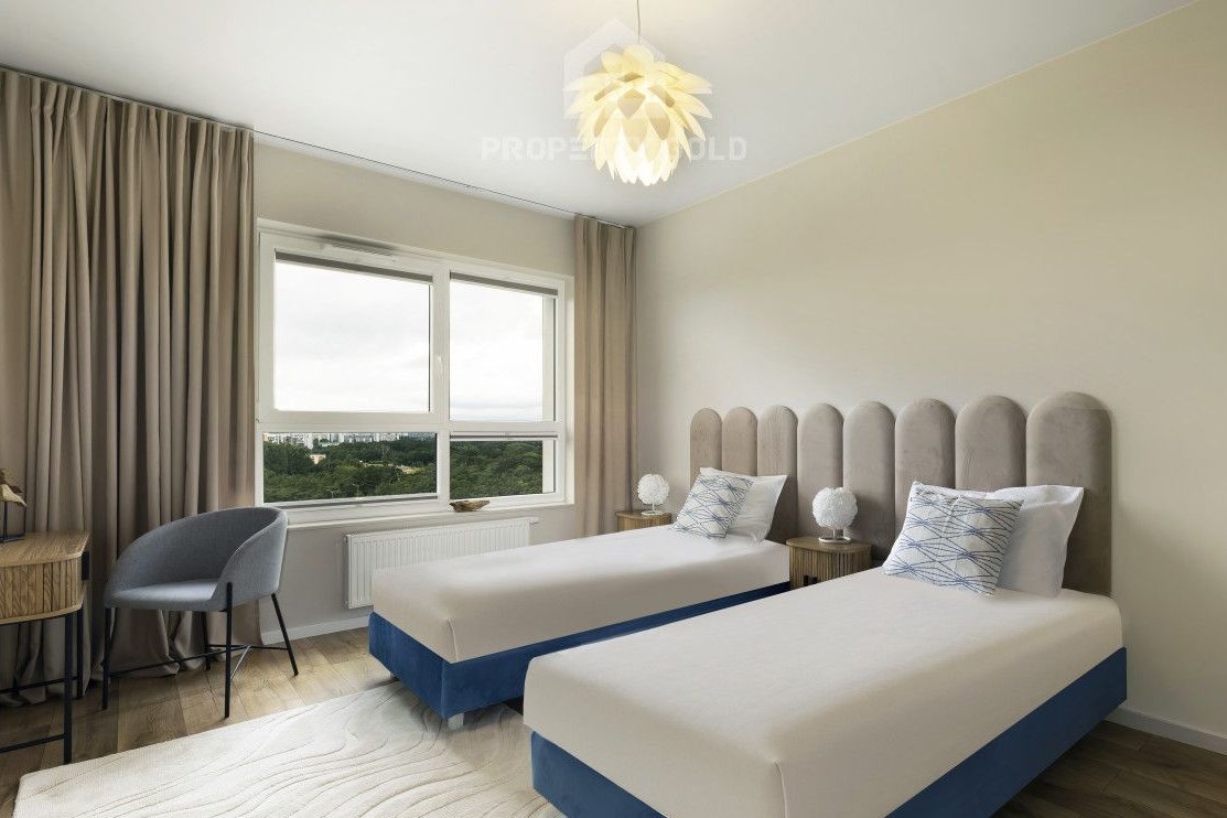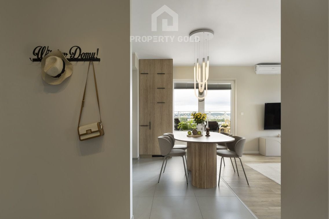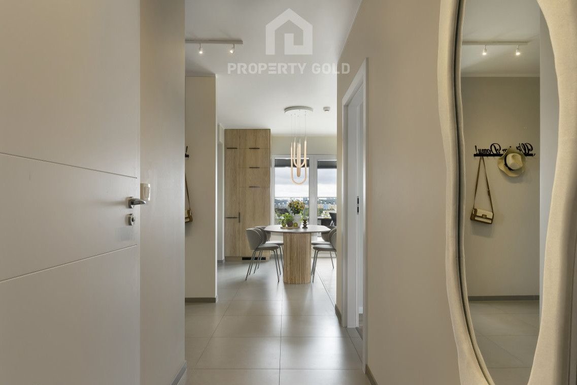 Umeblowany lokal o powierzchni 77m2 położony jest na ostatnim dwunastym piętrze budynku i składa się z: