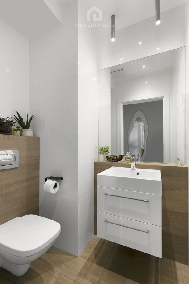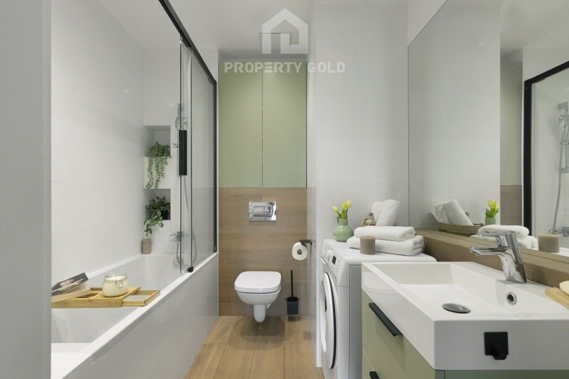 - jasnej łazienki wyposażonej w duże lustro, wannę z prysznicem, pralkę i toaletę,
