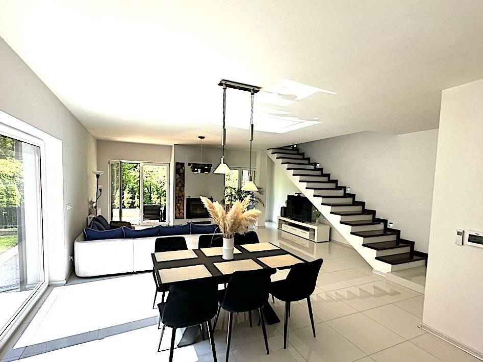Z salonu wyjście na zadbany ogród z meblami ogrodowymi. Dom kompletnie urządzony i gotowy do zamieszkania.