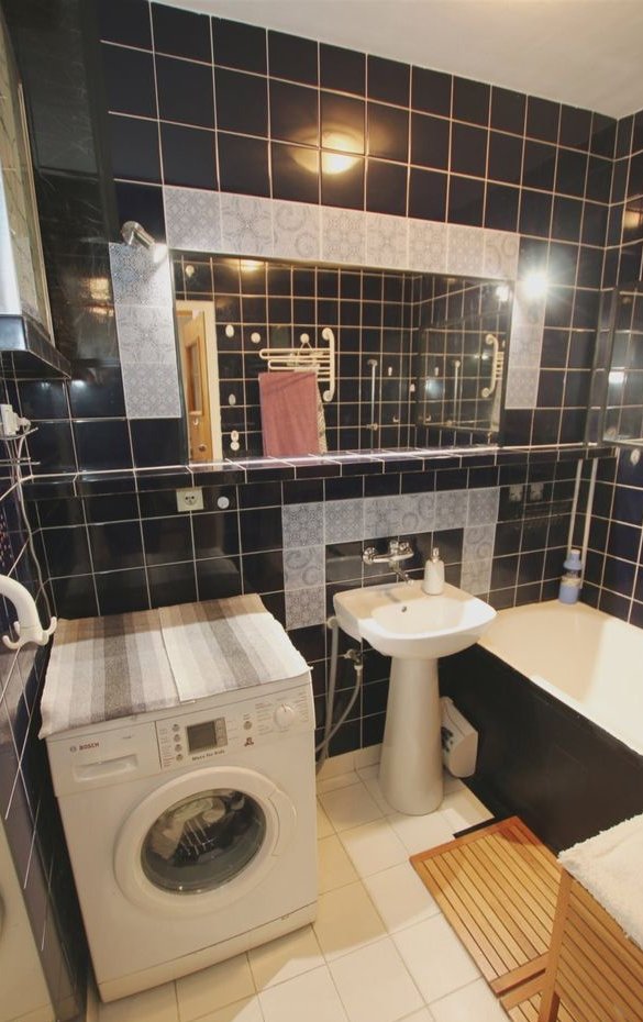 Łazienka 3m2 - terakota, glazura, umywalka, wanna, pralka.