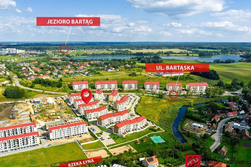 Nieruchomość położona jest w Bartągu – dynamicznie rozwijającej się, a zarazem spokojnej miejscowości na granicy Olsztyna. Budynek znajduje się przy ul. Bartąskiej 164, w bezpośrednim sąsiedztwie rzeki Łyny, w otoczeniu zieleni i malowniczych terenów spacerowych.