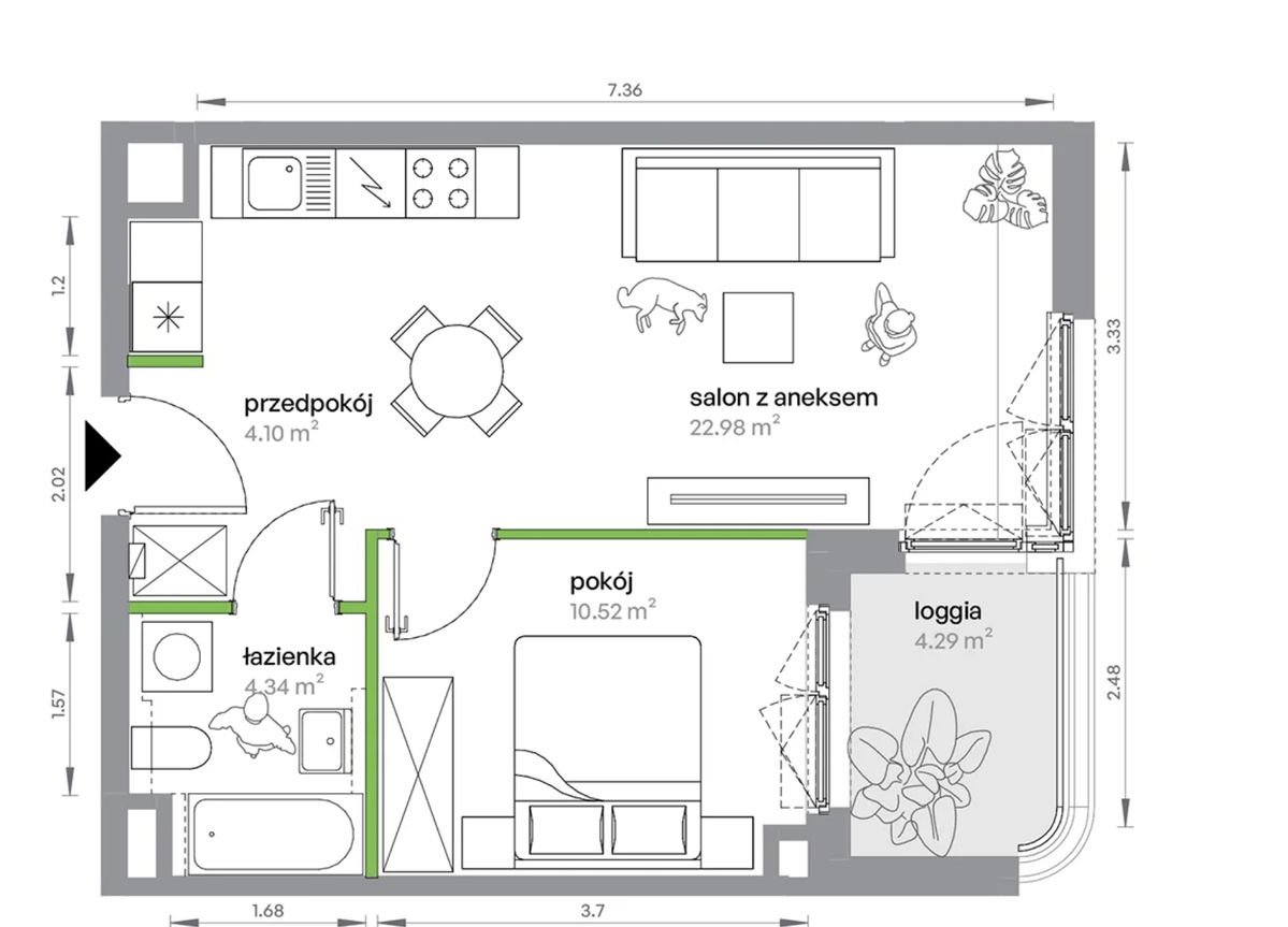 Mieszkanie posiada bardzo funkcjonalny, dobrze doświetlony układ – idealny dla singla, pary lub jako produkt inwestycyjny pod wynajem.