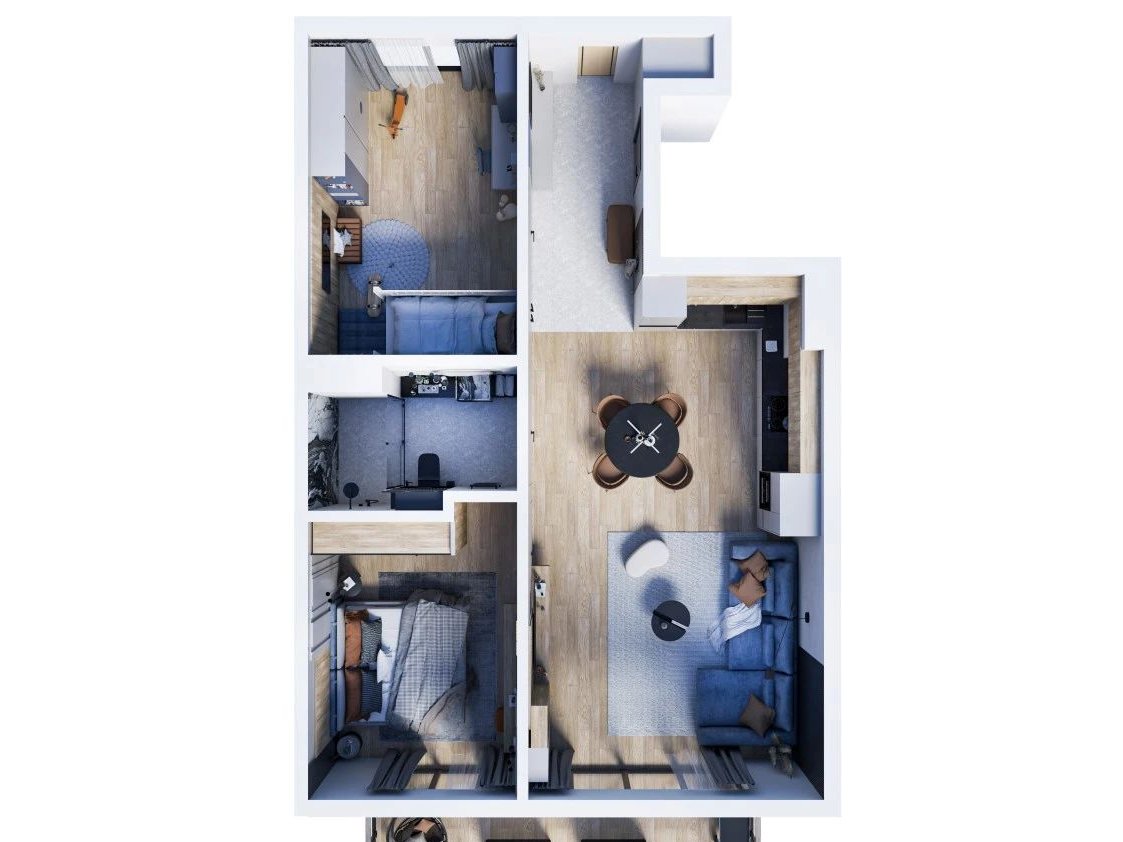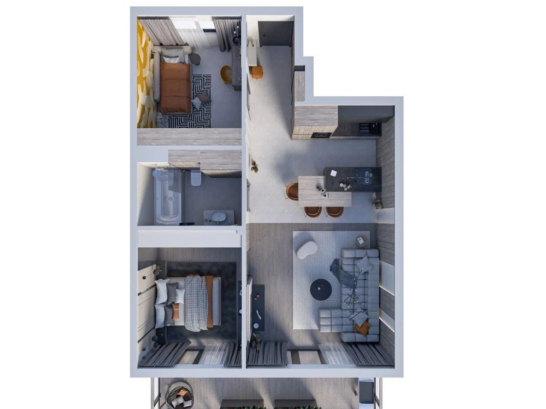 Możliwość zaaranżowania dwóch sypialni, salonu z aneksem kuchennym oraz łazienki z WC. Ekspozycja okien północ–południe zapewnia bardzo dobre doświetlenie wnętrz.