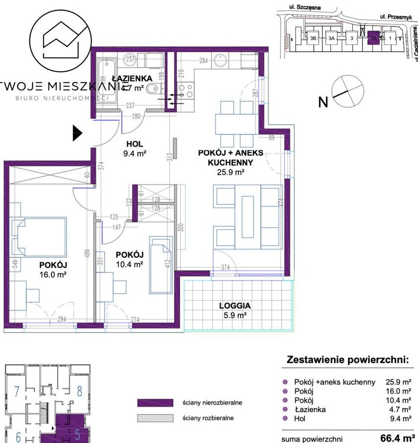 metraż: 66,7 m2, trzypokojowe