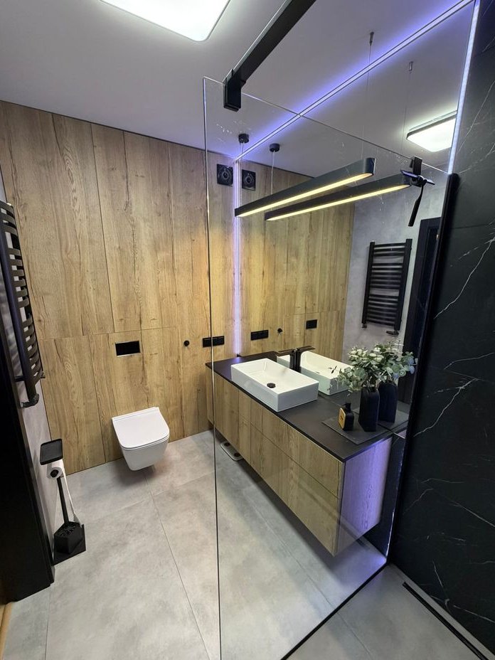 Całość tworzy spójną, nowoczesną przestrzeń z eleganckimi akcentami drewna i czerni.