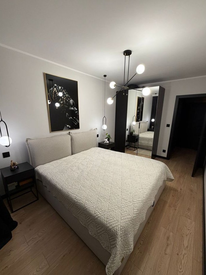 W każdym pokoju znajduje się pojemna szafa, co zapewnia doskonałą organizację przestrzeni i eliminuje potrzebę dodatkowych mebli.
