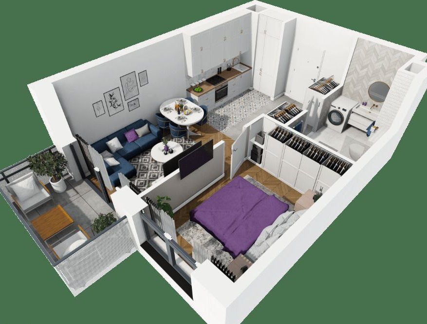 Nieruchomość składa się z salonu z aneksem oraz sypialni, holu, łazienki z WC,