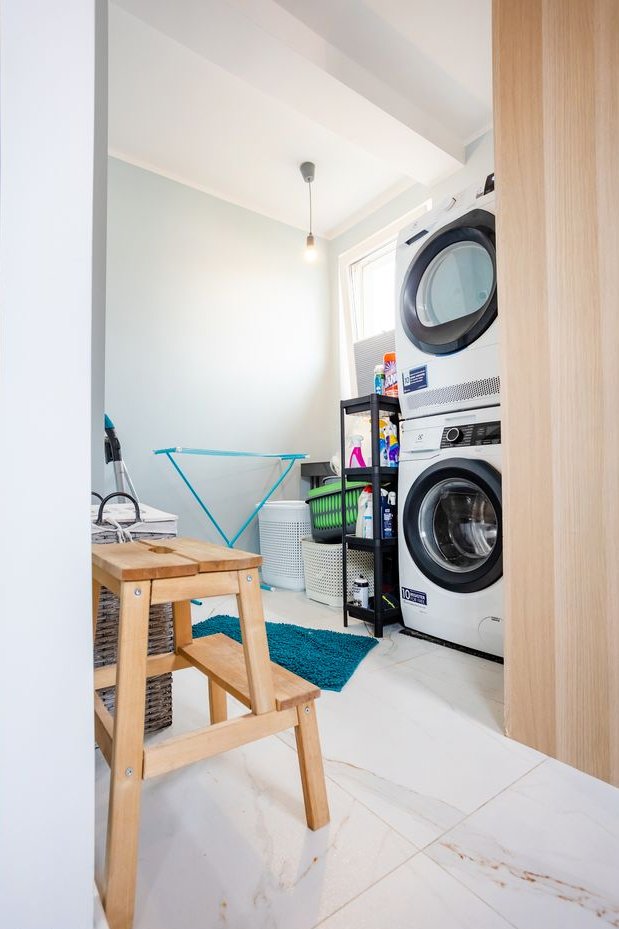 - sypialnia z wydzieloną pralnią (pralka i suszarka bębnowa) oraz ogromną garderobą,