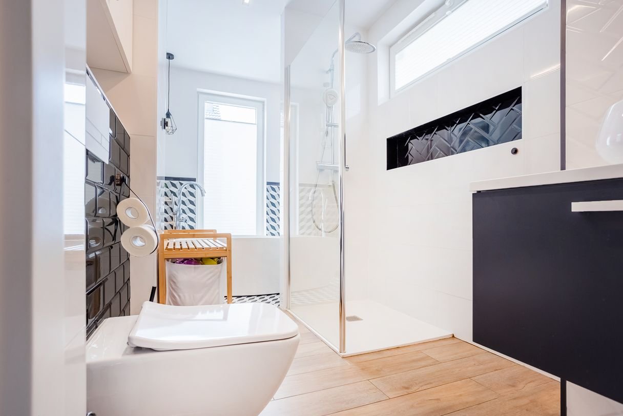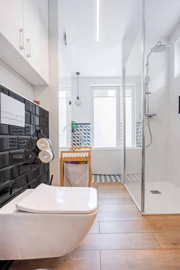 - toaleta dla gości (wysokiej jakości armatura) oraz praktyczna zabudowa do przechowywania kosmetyków i chemii,