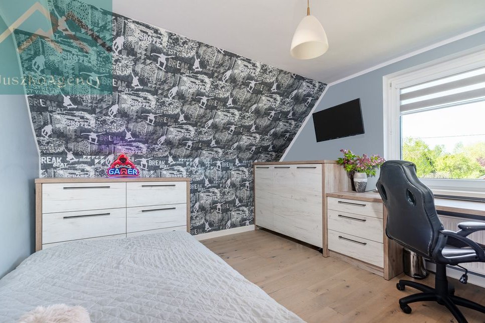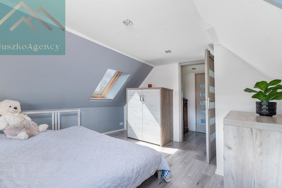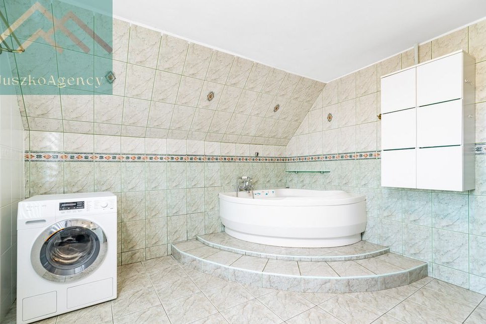 Na piętrze znajduje się główna sypialnia z wyjściem na balkon, garderoba, jedna z sypialni oraz bardzo duża łazienka z wanną.