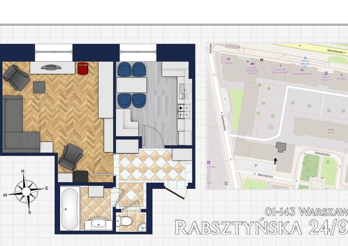 Mieszkanie znajduje się na 2 piętrze 4-piętrowej kamienicy, przy rogu ul. Sokołowskiej i Rabsztyńskiej, z oknami wychodzącymi na zielone, zadrzewione podwórko - mieszkanie jest bardzo zaciszne, zapewnia prywatność. Mieszkanie obejmuje: