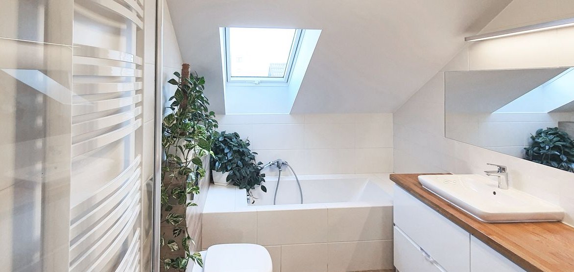 Łazienka (ok. 7,1 m²) wyposażona w wannę oraz prysznic.