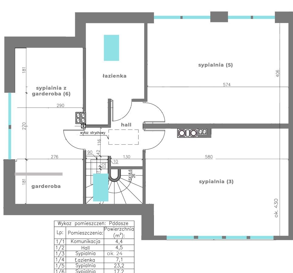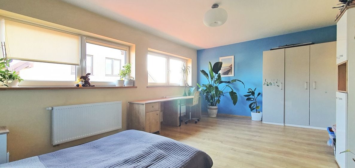 Trzy ustawne sypialnie o powierzchniach: 23 m², 24 m² oraz 17,5 m² (sypialnia z wydzieloną garderobą).
