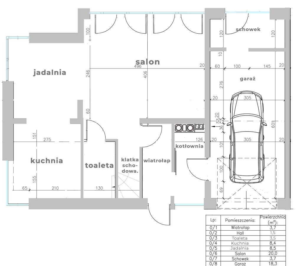 Garaż w bryle budynku (23 m²) z bramą na pilota oraz dodatkowe pomieszczenie gospodarcze.