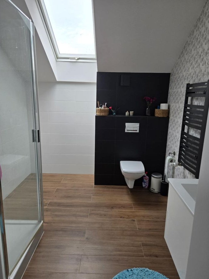 duża łazienka wyposażona w prysznic i wannę, zabudowane szafy (piec gazowy firmy Junkers)
