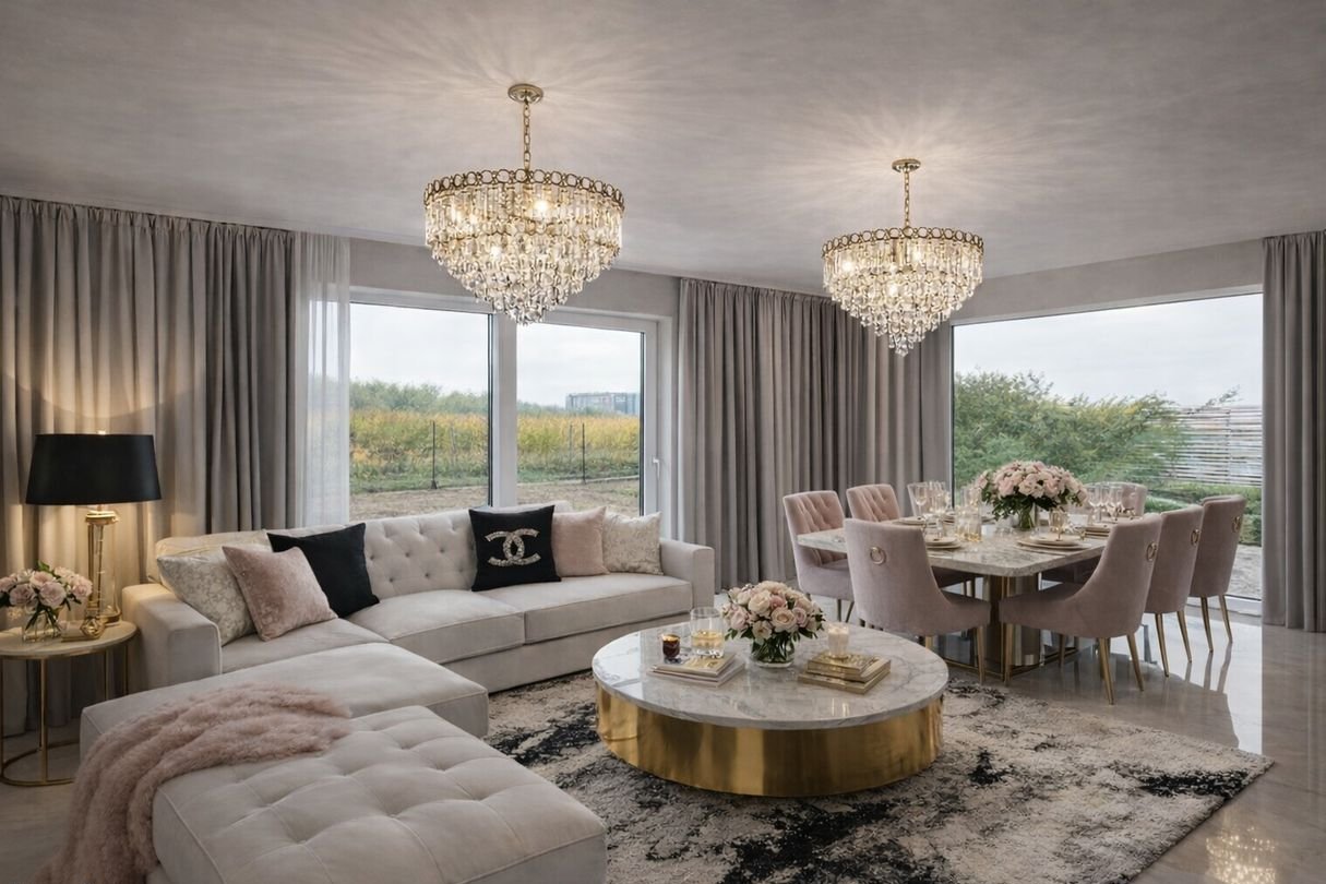 przestronny salon z kominkiem, wielkim oknem typu FIX w części jadalniane oraz z dużym oknem przesuwnym typu Smart Slide - wyjście na zadaszony taras i ogród ~ 500 m²,