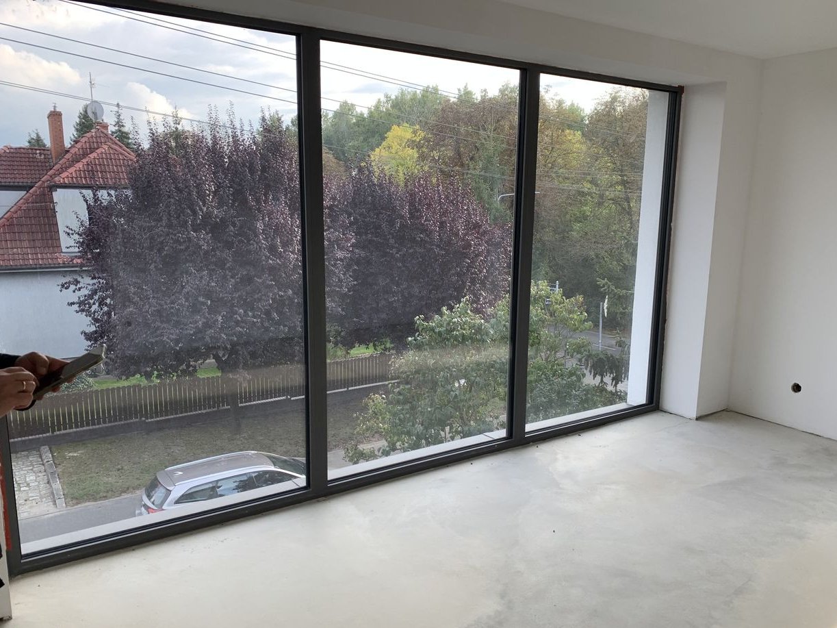 Nowoczesne okna i drzwi aluminiowe Reynaers, 3-szybowe, kolor RAL 9008.