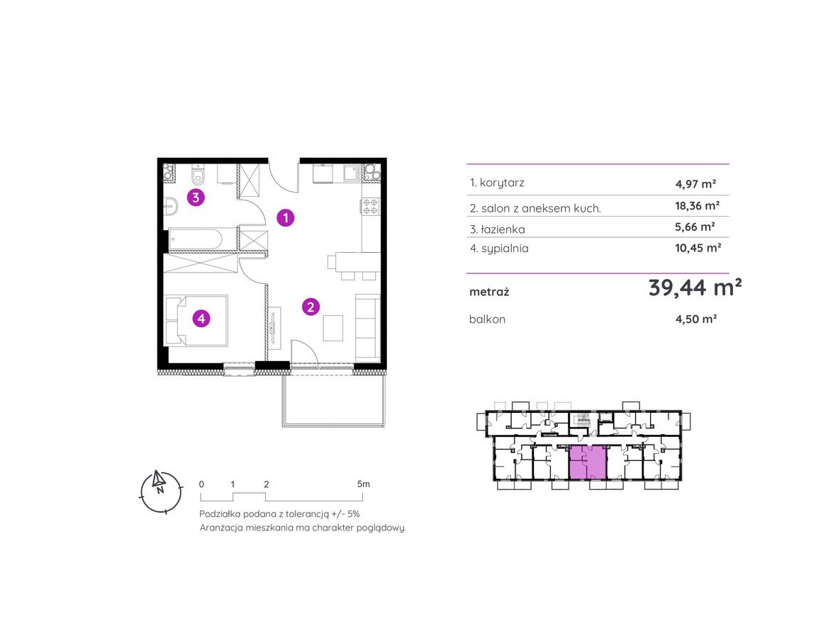 Mieszkanie dwupokojowe o pow. 39,44m2 znajdujące się na 6. piętrze nowego budynku.