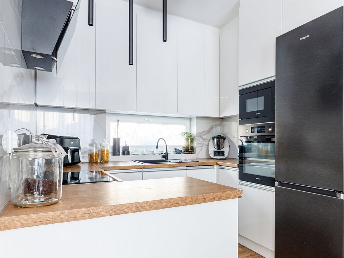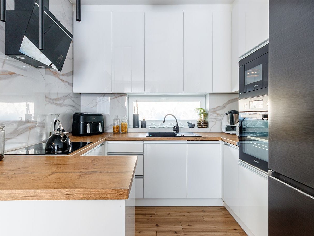 Kuchnia jest otwarta na jadalnię, tworząc spójną i wygodną strefę dzienną.
