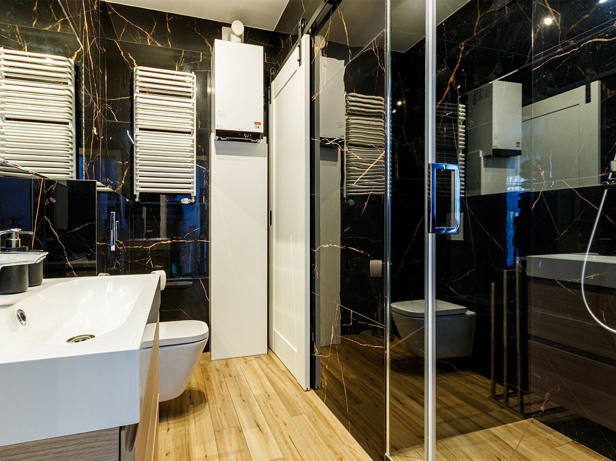 Dodatkowo na tym poziomie znajduje się łazienka z prysznicem oraz hall.
