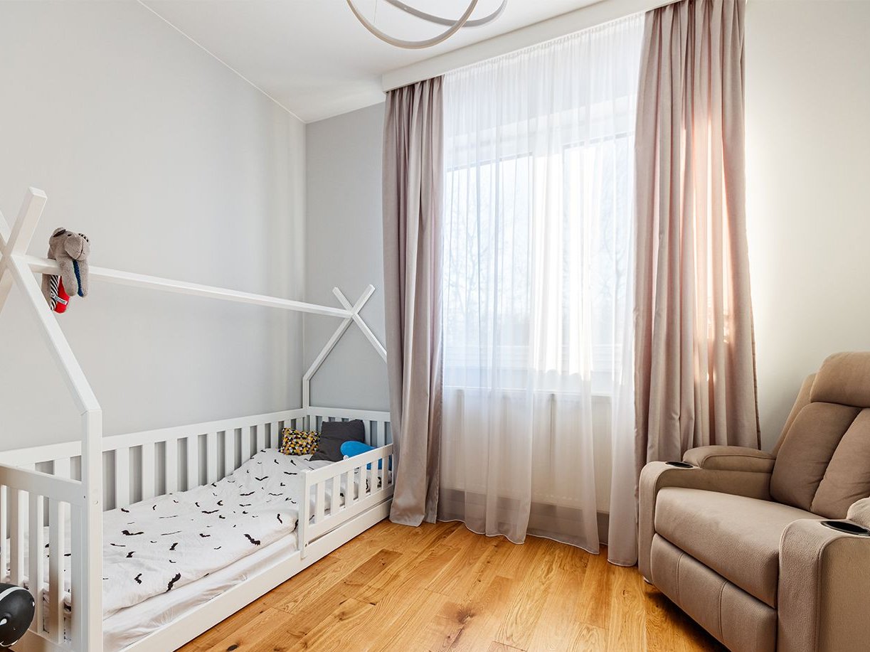 Piętro obejmuje trzy ustawne pokoje, które mogą pełnić funkcję sypialni, pokoju dziecięcego lub gabinetu, a także łazienkę z wanną zapewniającą komfort domownikom.