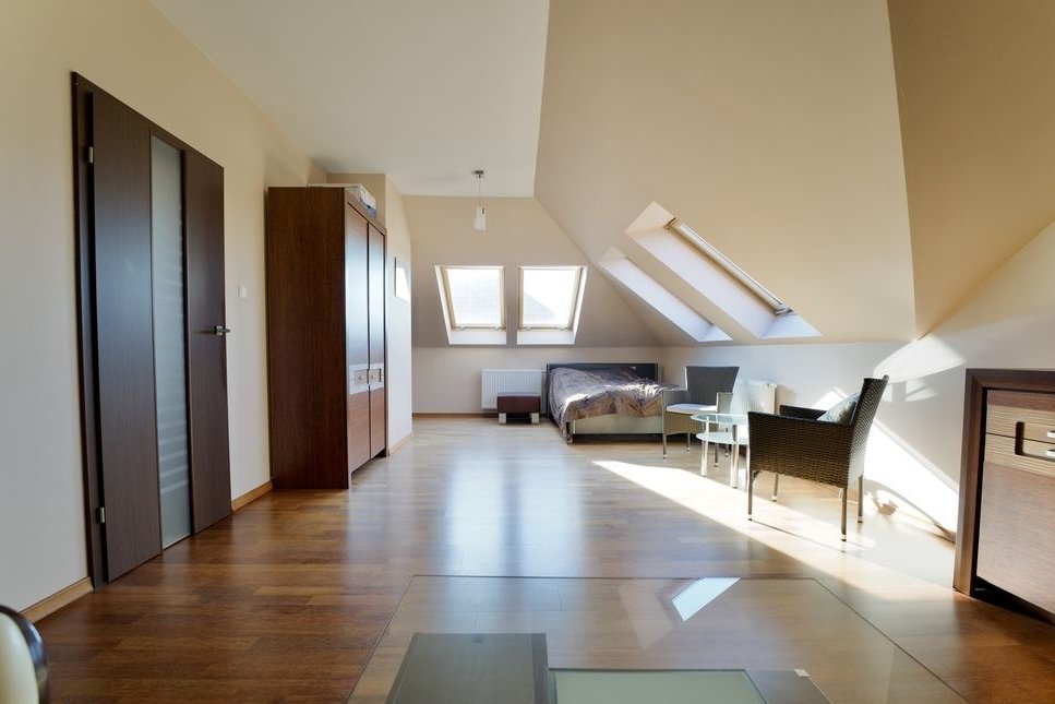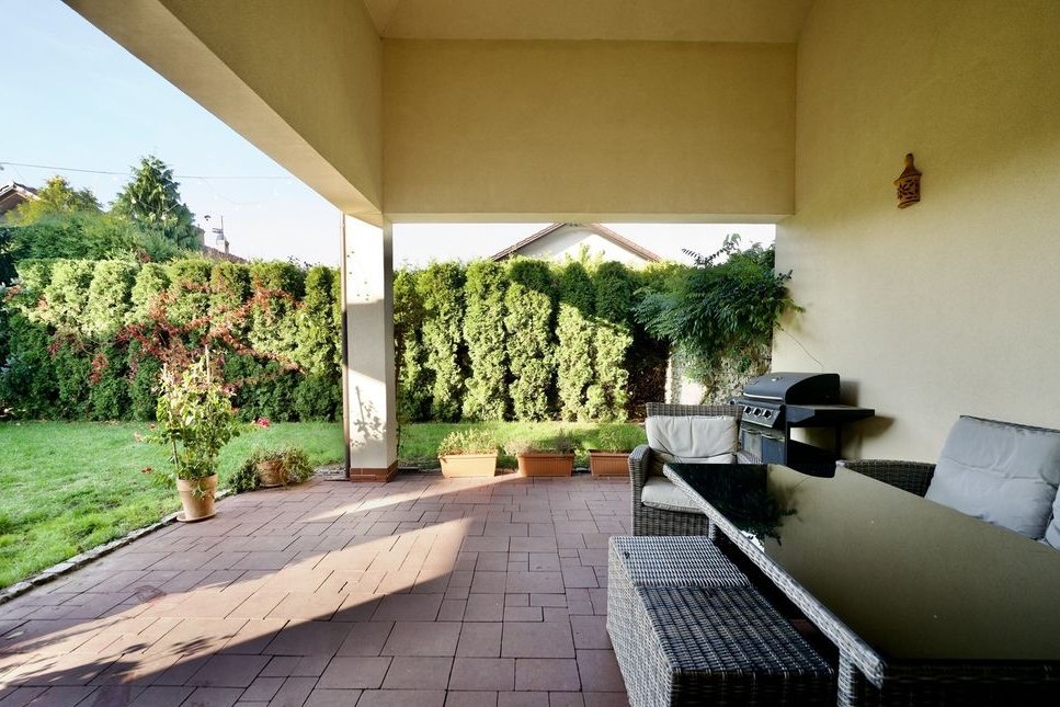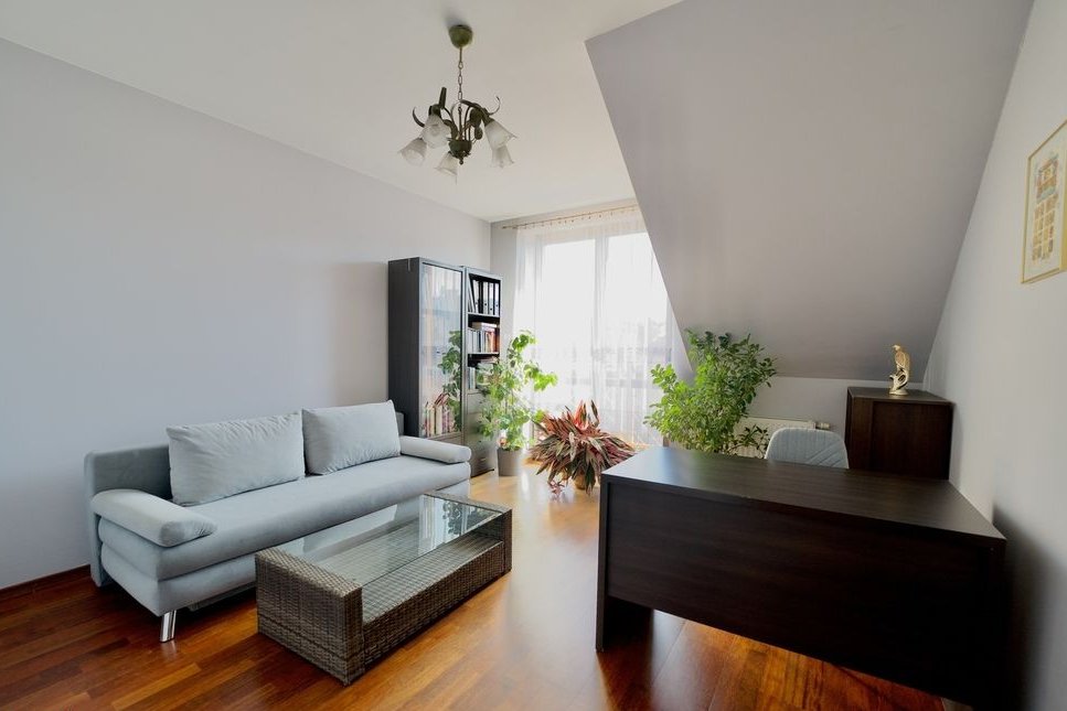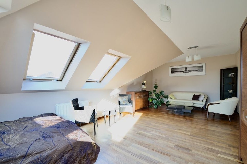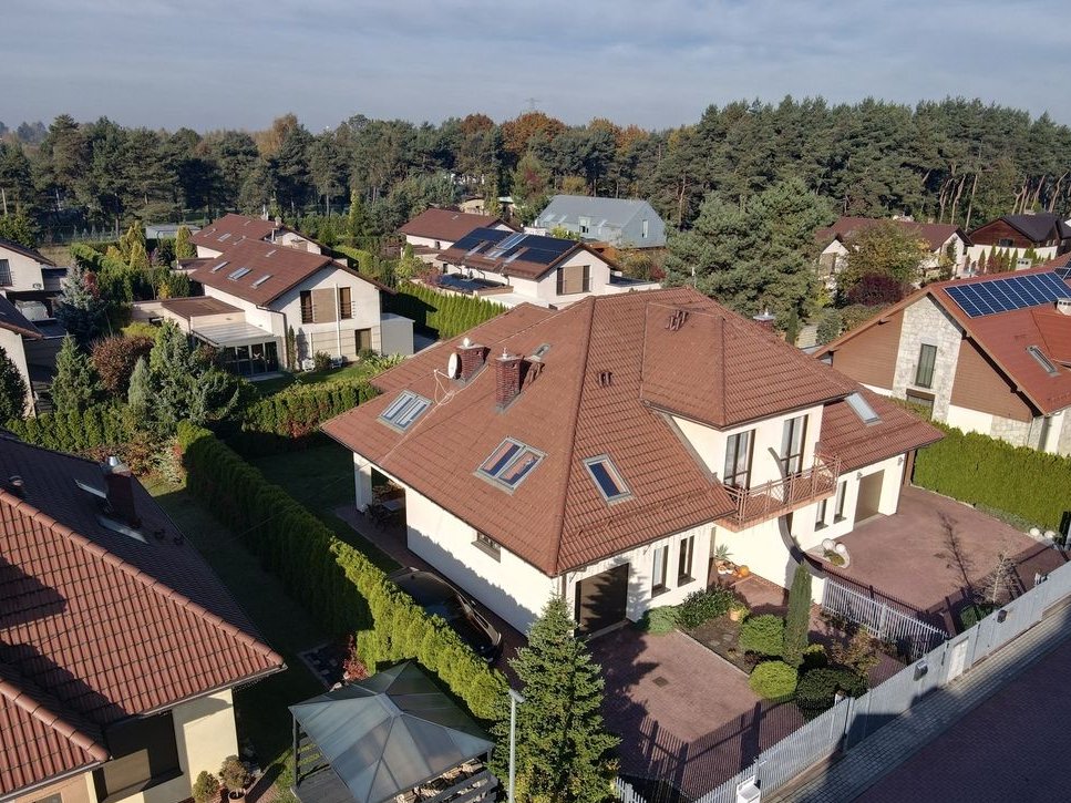 Dom oferuje również dodatkowe możliwości aranżacyjne – posiada strych o powierzchni około 40 m², który można zagospodarować na dodatkowe pokoje, pracownię lub inne pomieszczenia zgodnie z potrzebami nowego właściciela. Dużym atutem są także dwa zadaszone tarasy: większy o powierzchni ponad 30 m², idealny do wypoczynku na świeżym powietrzu, oraz mniejszy, 6 m². Ekspozycja południowa sprawia, że dom i ogród są doskonale nasłonecznione przez cały dzień.