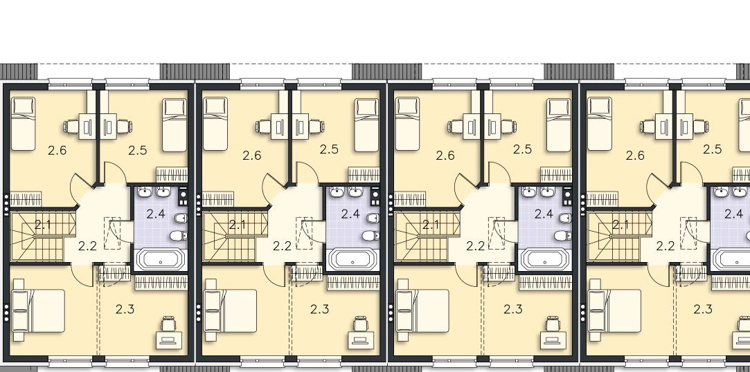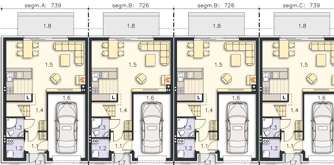 Nowoczesne segmenty z oszczędnym ogrzewaniem gazowym, wodą z miejskiego ujęcia, oraz kanalizacją miejską. Przemyślane rozłożenie pomieszczeń pozwala na dużą swobodę w urządzaniu z zachowaniem funkcjonalności budynku.