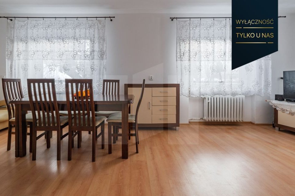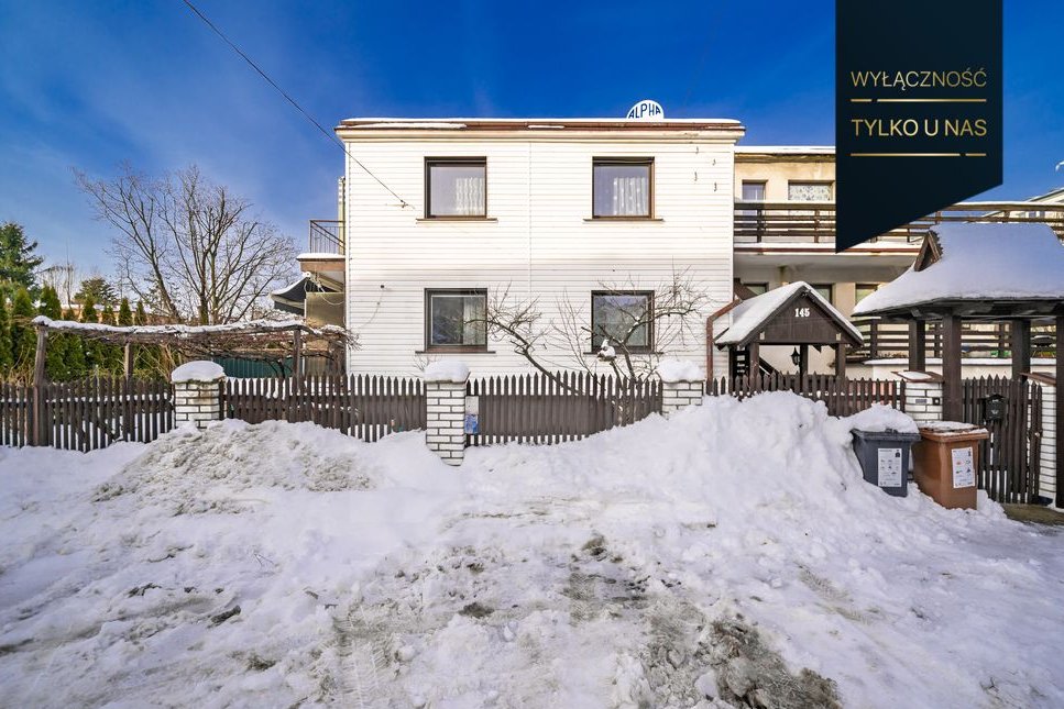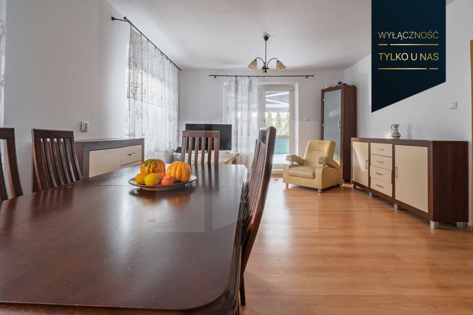 Dom o powierzchni całkowitej ok. 180 m² jest 3-kondygnacyjny (przyziemie, wysoki parter, piętro) i oferuje bardzo funkcjonalny układ pomieszczeń. Na parterze znajduje się przestronny salon z jadalnią i kominkiem, z wyjściem na taras z markizą oraz do ogrodu, osobna kuchnia z dwoma oknami i wyjściem na taras, a także WC. Piętro to trzy sypialnie, w tym jedna z balkonem, oraz komfortowa łazienka z oknami. Przyziemie pełni funkcję zaplecza gospodarczego i obejmuje m.in. kotłownię, spiżarnię, pomieszczenia magazynowe oraz garaż dwustanowiskowy w bryle budynku.