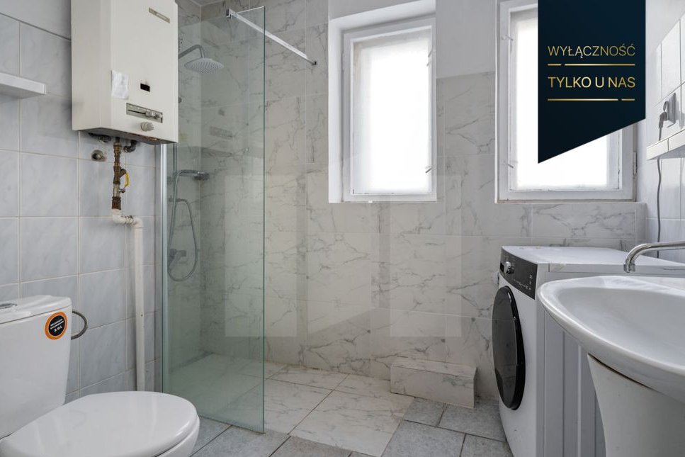 łazienka (5,47 m2) z WC, prysznicem bezprogowym, pralką, umywalką, lustrem i dwoma oknami,